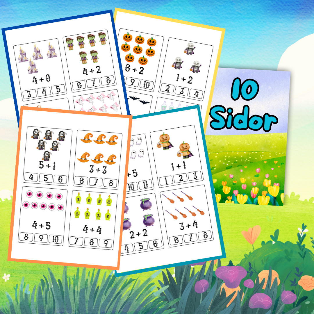 10 sidor med enklare addition i form av kort, 4 kort per sida.