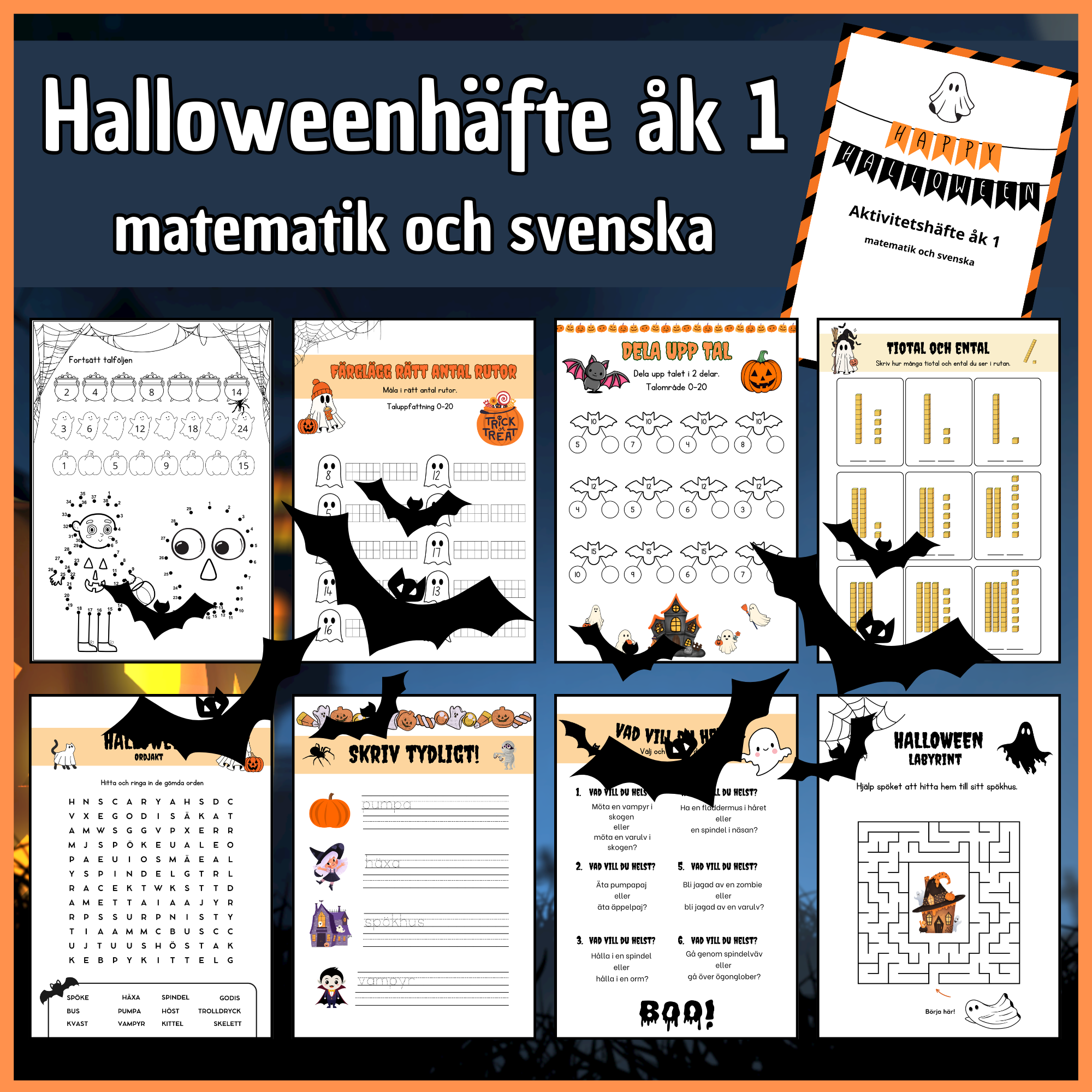 Halloween åk 1, 8 sidor, matematik och svenska + labyrint