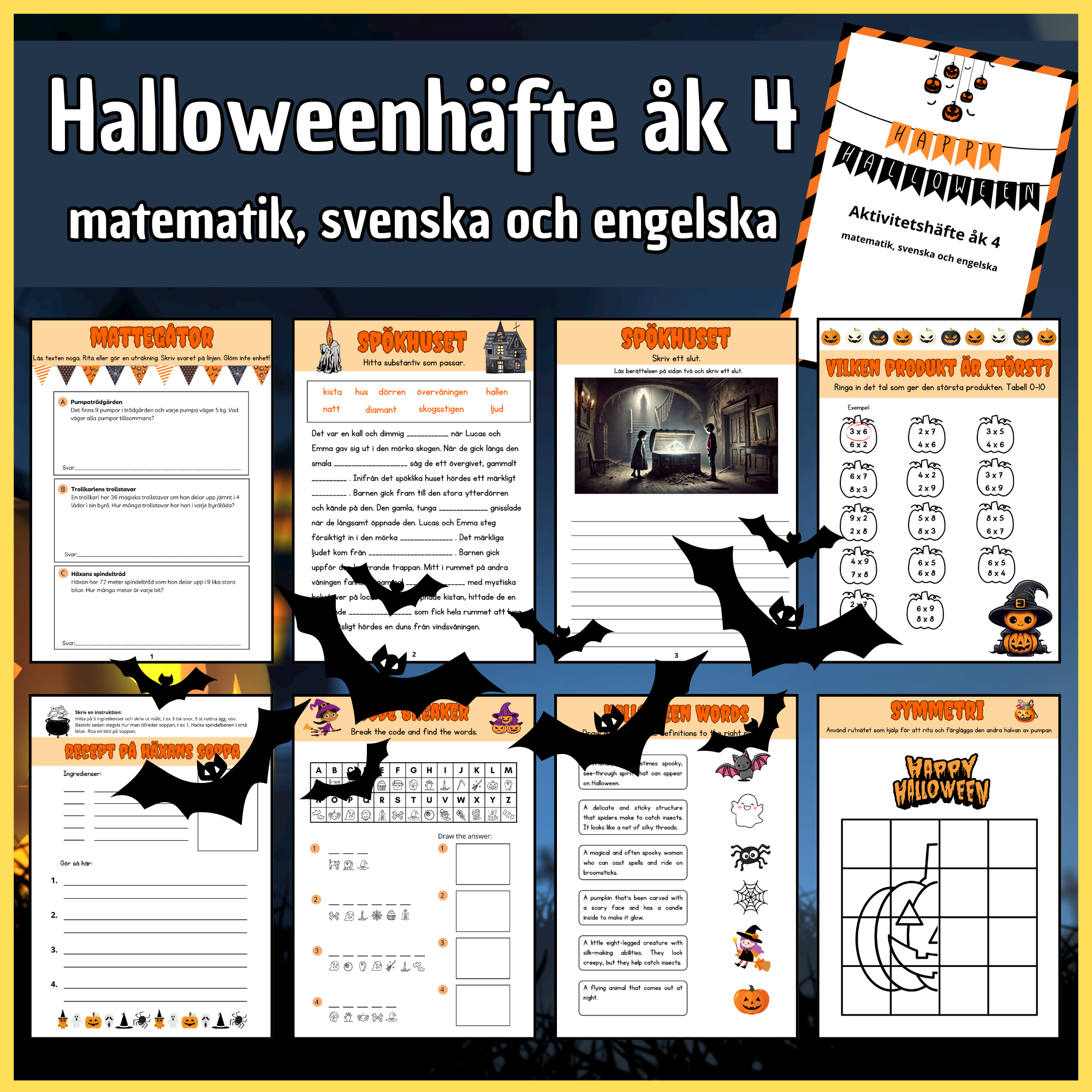 Halloween åk 4, matematik, svenska och engelska, 8 sidor