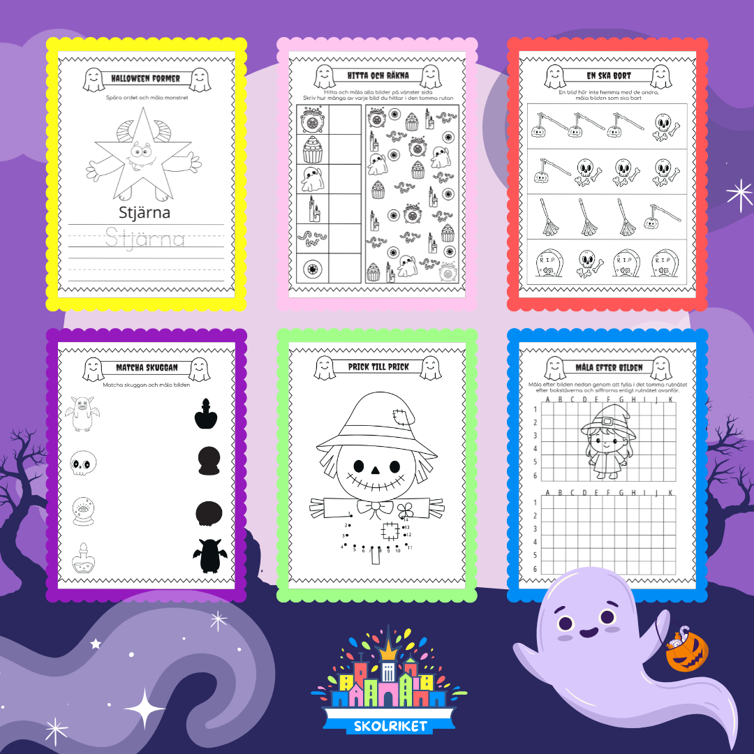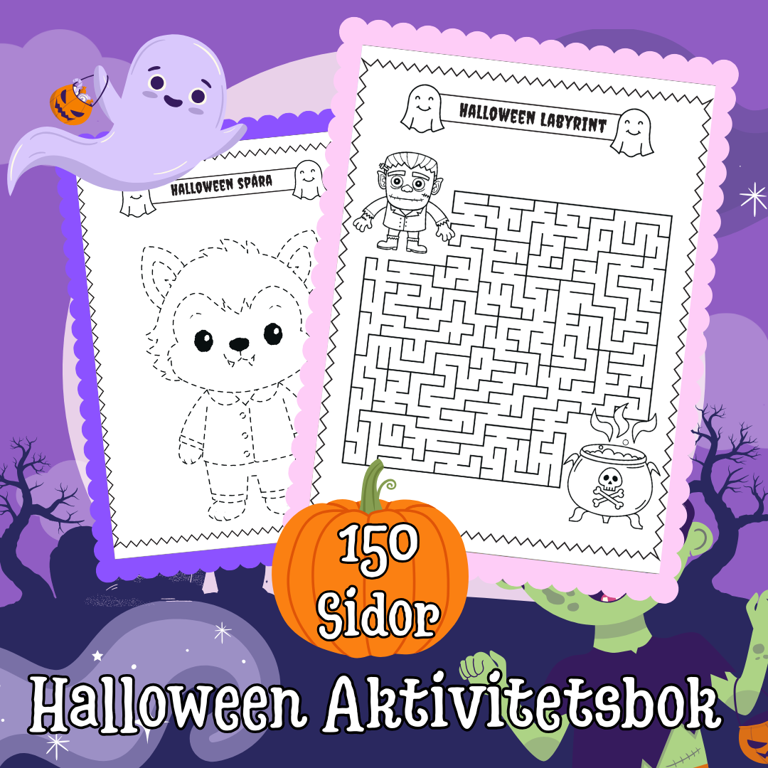 Den här Halloween-inspirerade aktivitetsboken är full av roliga utmaningar för barn som gillar att räkna, måla, klippa och klura. Perfekt för förskola och lågstadiet – hemma eller i klassrummet.