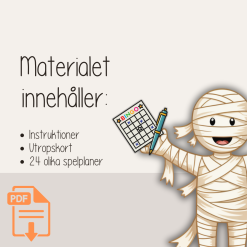 Spela Bingo med dessa Halloweenfigurer. Materialet innehåller instruktioner, utropskort samt 24 olika spelplaner.