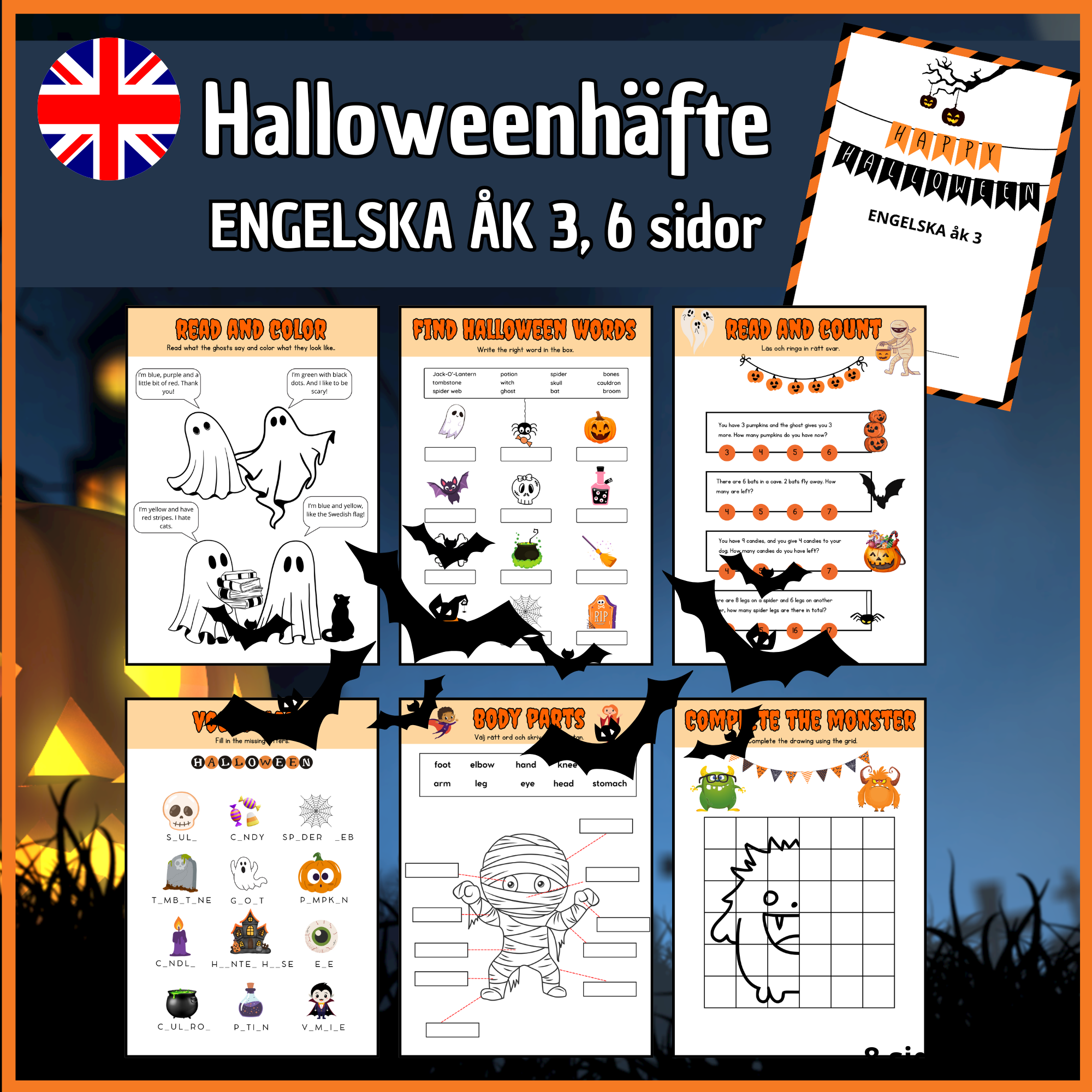 Halloween engelska åk 3, 6 sidor (5 sidor eng + 1 sida pyssel)