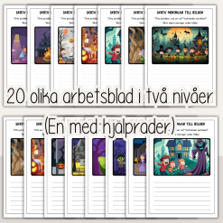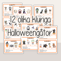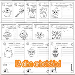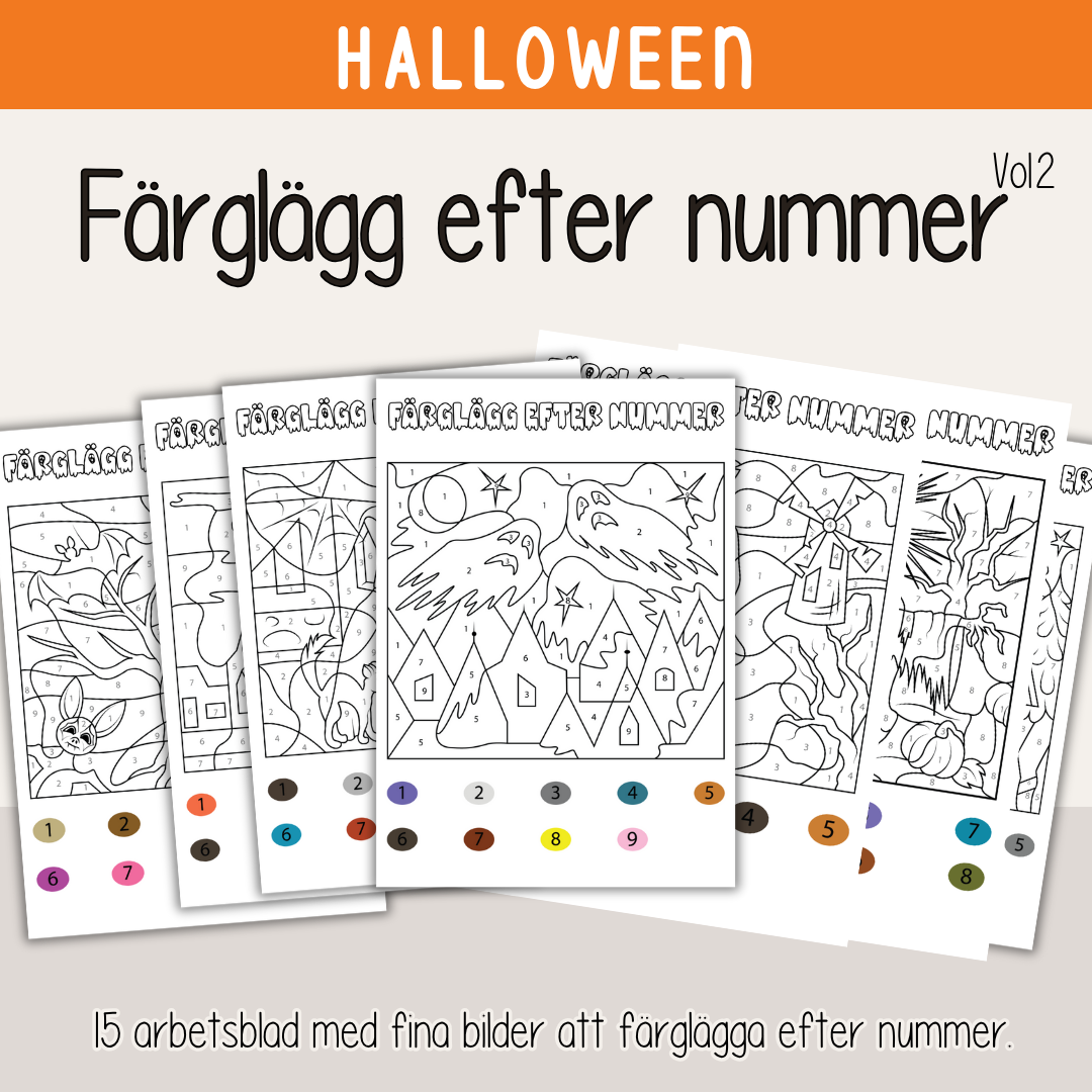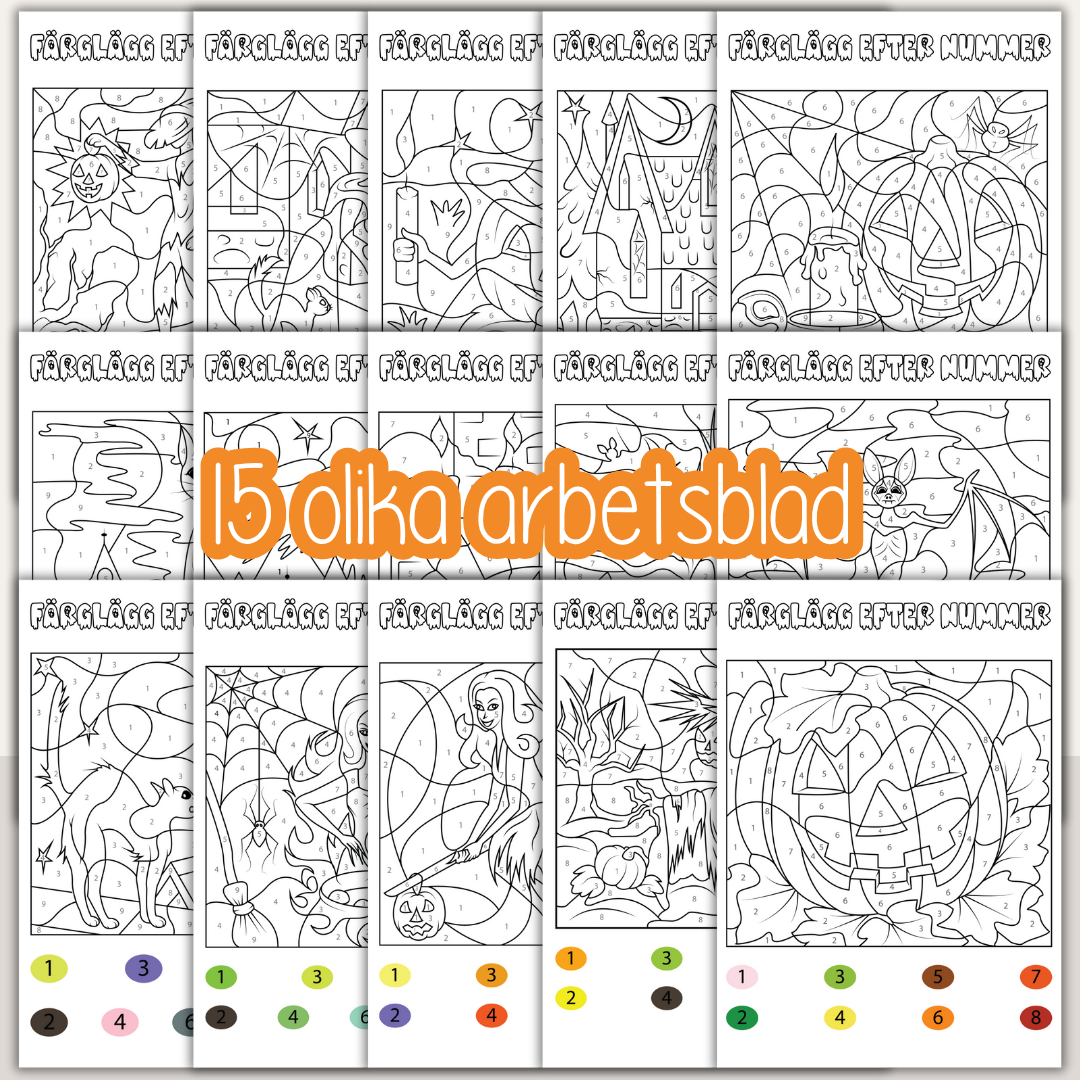 15 st olika bilder med Halloweentema att färglägga efter nummer.