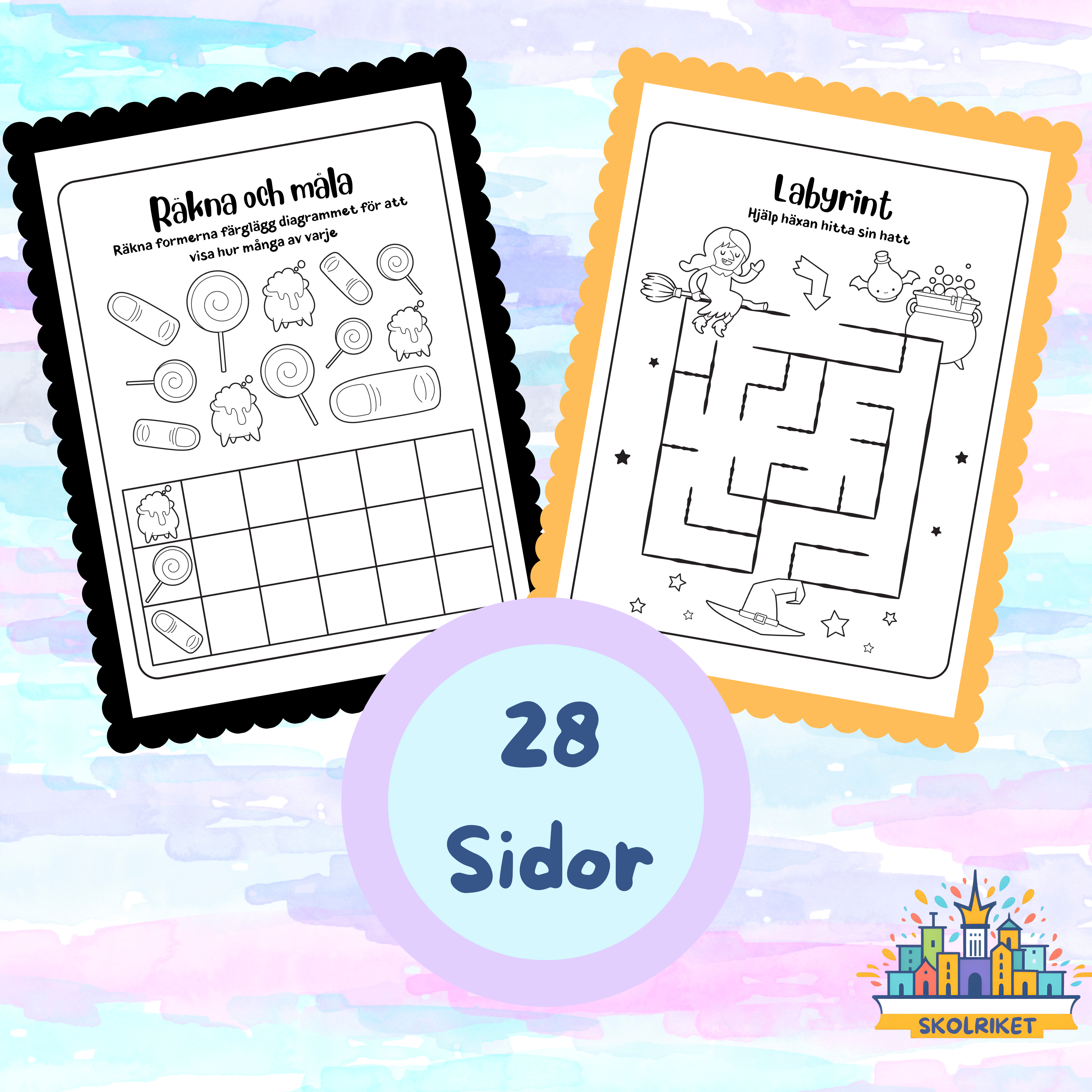 28 sidor att måla, lösa labyrint, räkna och måla samt enklare matte problem att lösa.