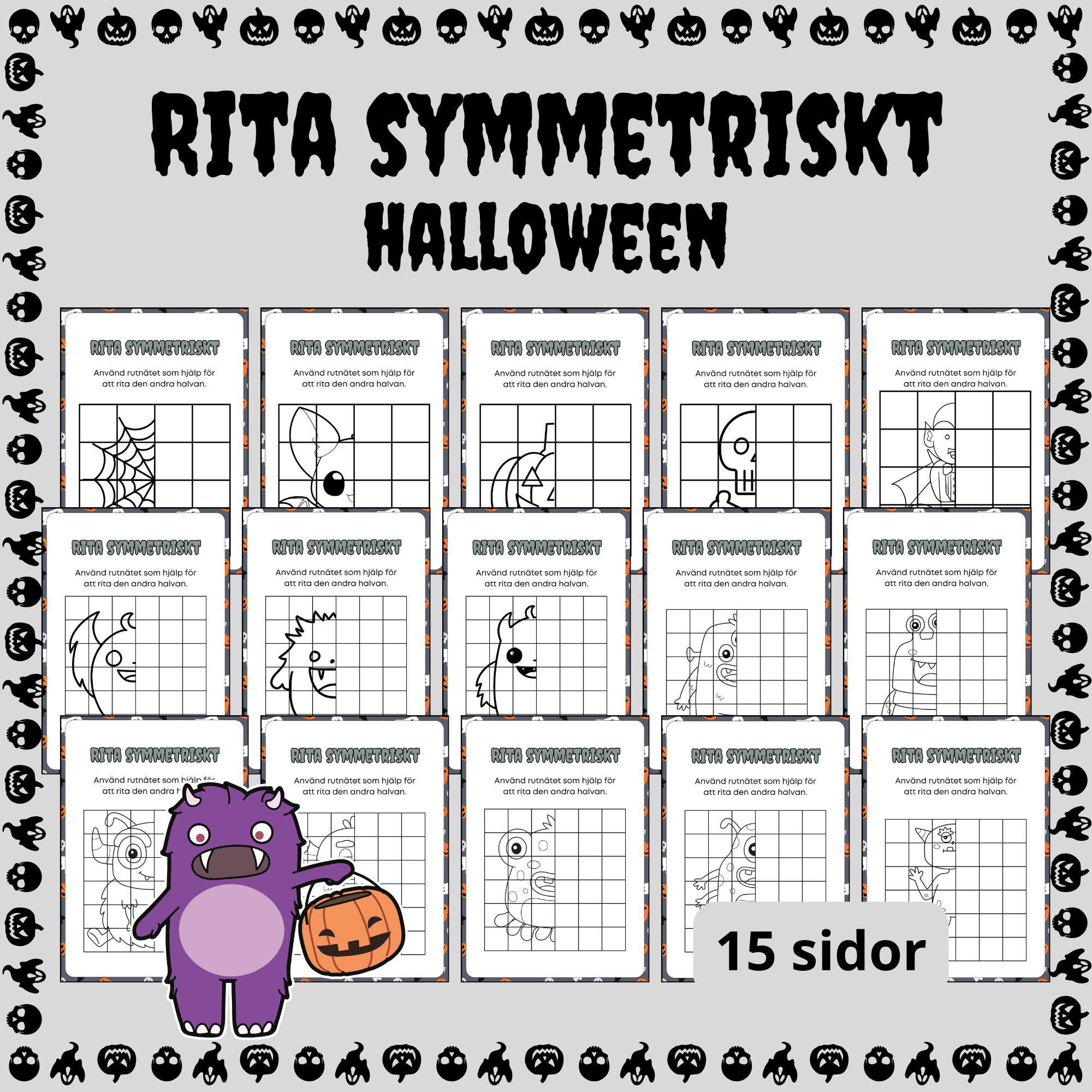 15 sidor blandande motiv med halloweentema. Använd rutnätet för att rita färdigt andra sidan