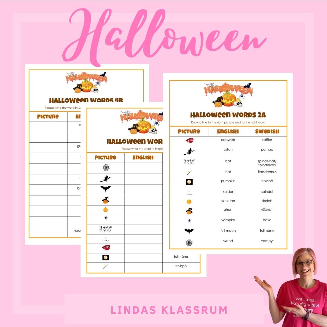 Halloween words är ett material bara på engelska. Materialet är på 10 sidor med 5 olika uppgifter kring halloweenord.