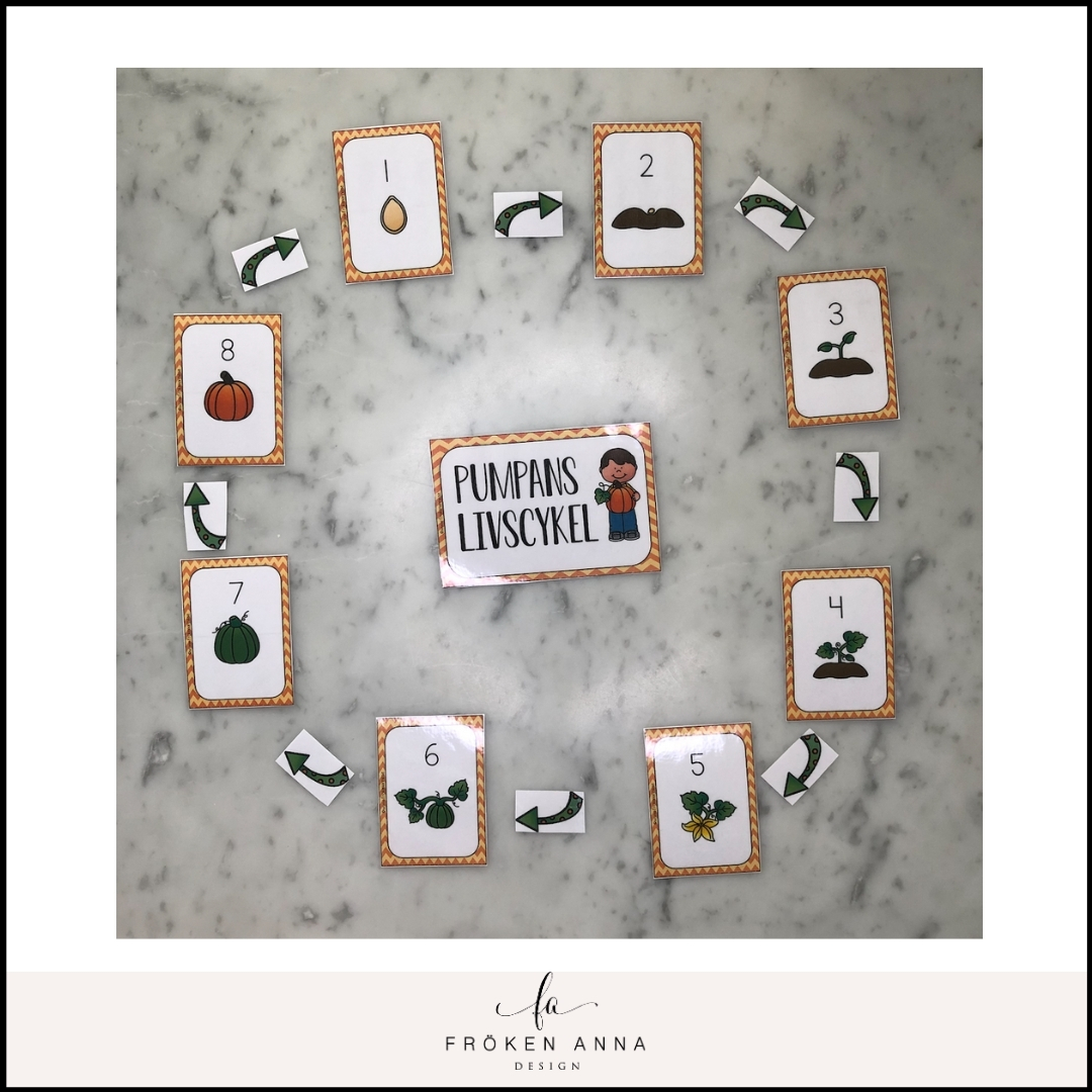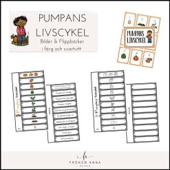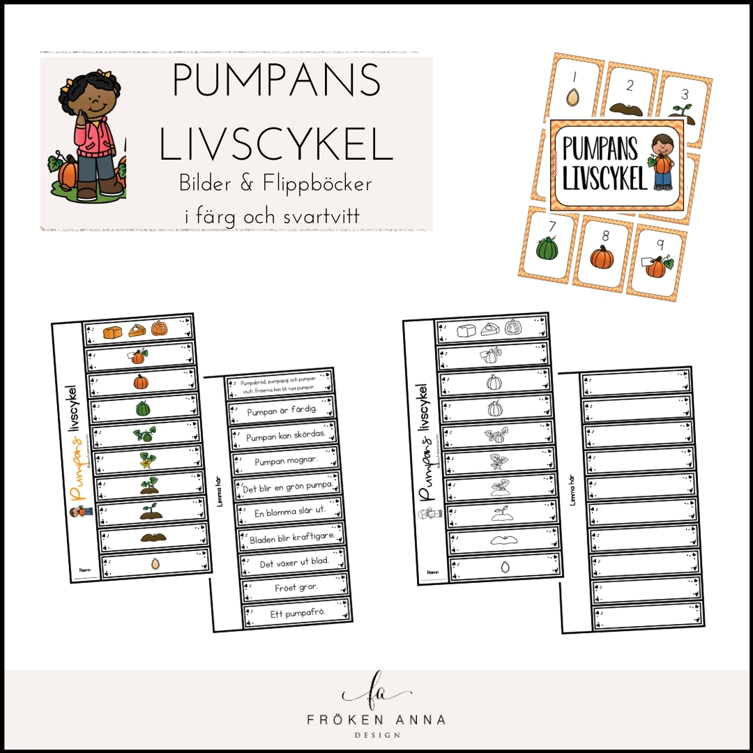 Pumpans livscykel: Två moment ingår: Bilder över pumpans livscykel till lärarens demonstration, samt två olika flippböcker i färg och svartvitt, med och utan text. Dessa kan anpassas så elever som kan skriva själva får pappret utan text och de som behöver får en färdig beskrivning.