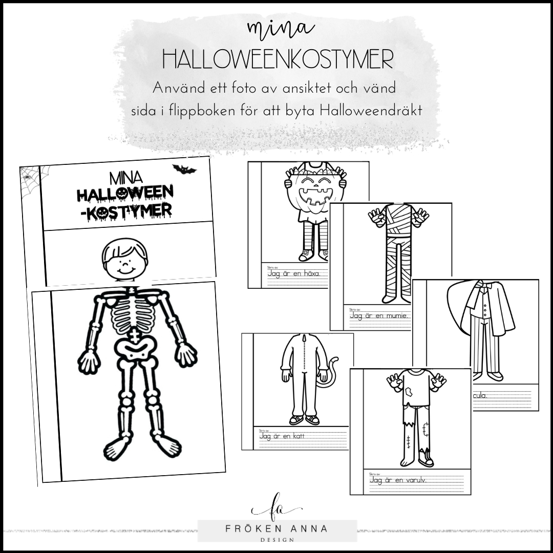 MIina Halloweenkostymer: En bilduppgift eleverna kommer att älska, för vem tycker inte om att klä ut sig på Halloween? ? Materialet är mycket enkelt att använda och passar till barn och elever i alla åldrar. Det enda som behövs är sax, lim och färgpennor eller tusch!Klipp ut ett foto av barnets ansikte (eller använd de färdiga ansiktsmallarna) och limma fast på flippboken. Häfta i marginalen för att sätta ihop sidorna i boken och bläddra bland de olika Halloweenkostymerna.