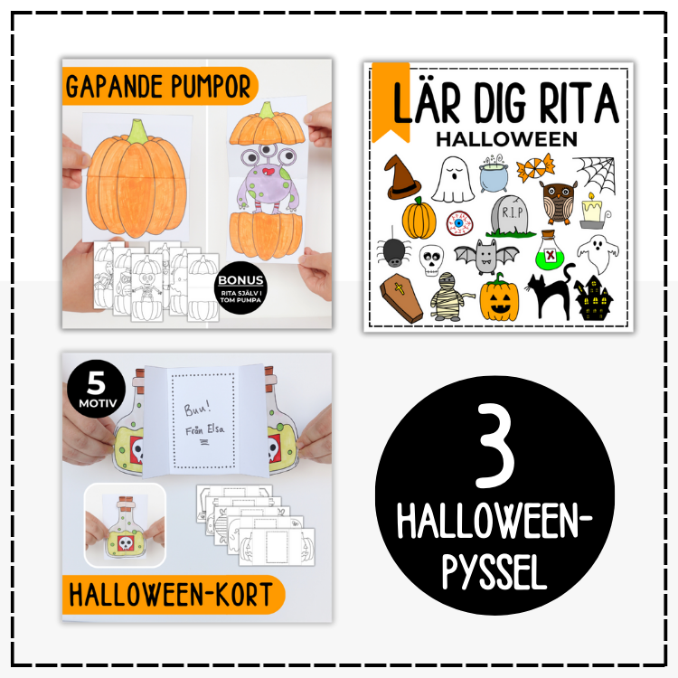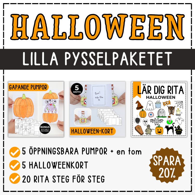 Lilla pysselpaketet är ett halloweenpaket med tre av mina halloweenpyssel (20 % rabatt jämfört med att köpa materialet styckevis).