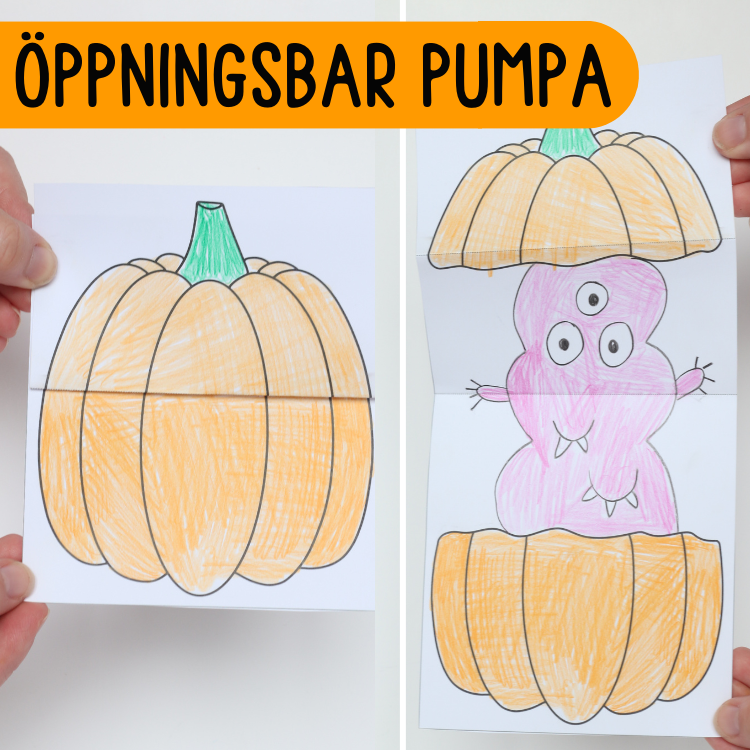 Halloweenpyssel – gör en pumpa som kan öppnas och stängas. Låt eleverna rita en egen figur som gömmer sig i pumpan. Färglägg, klipp och vik enligt instruktionerna.