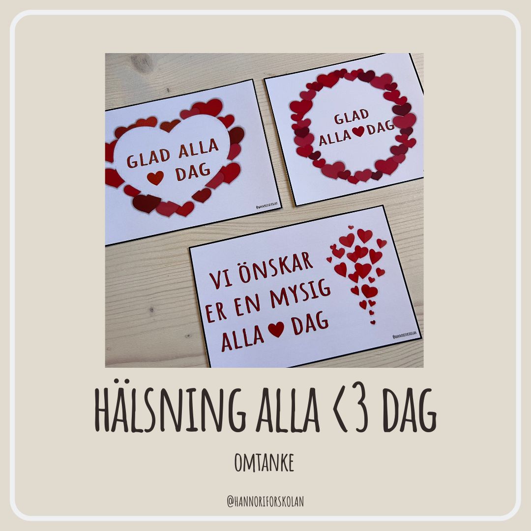 Hälsning alla <3 dag – sätt upp hälsningen i hallen där barn och föräldrar passerar. Sprid glädje och omtanke!