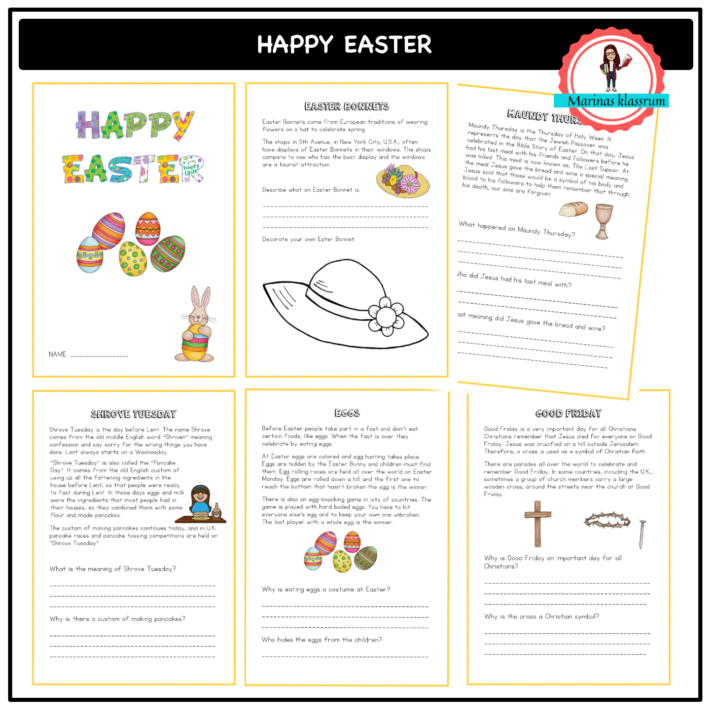 Ett arbetshäfte på engelska kring påskens firande och traditioner i USA och U.K. faktatexter med frågor och olika elevuppgifter.
