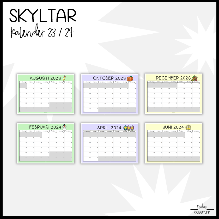 Kalenderblad för läsåret 2023/2024, från augusti till juli.