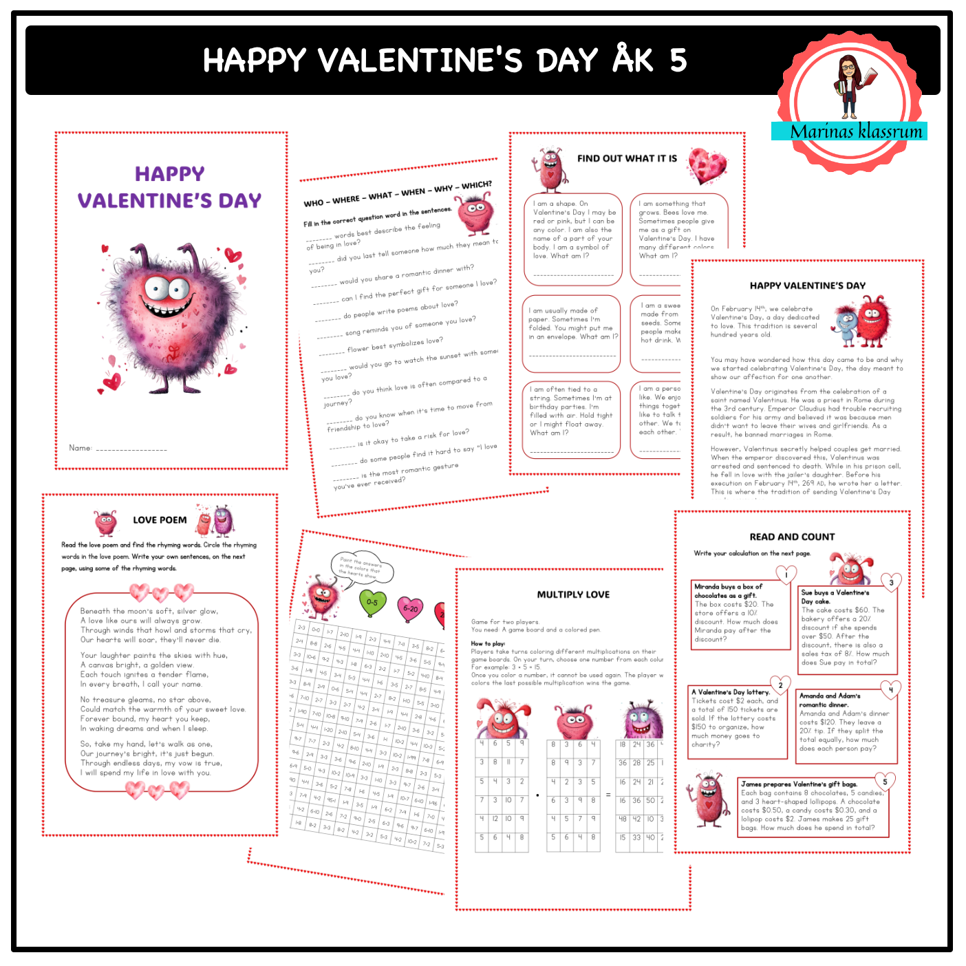 Ett arbetshäfte på engelska med ett kärlekstema med söta kärleksmonster.