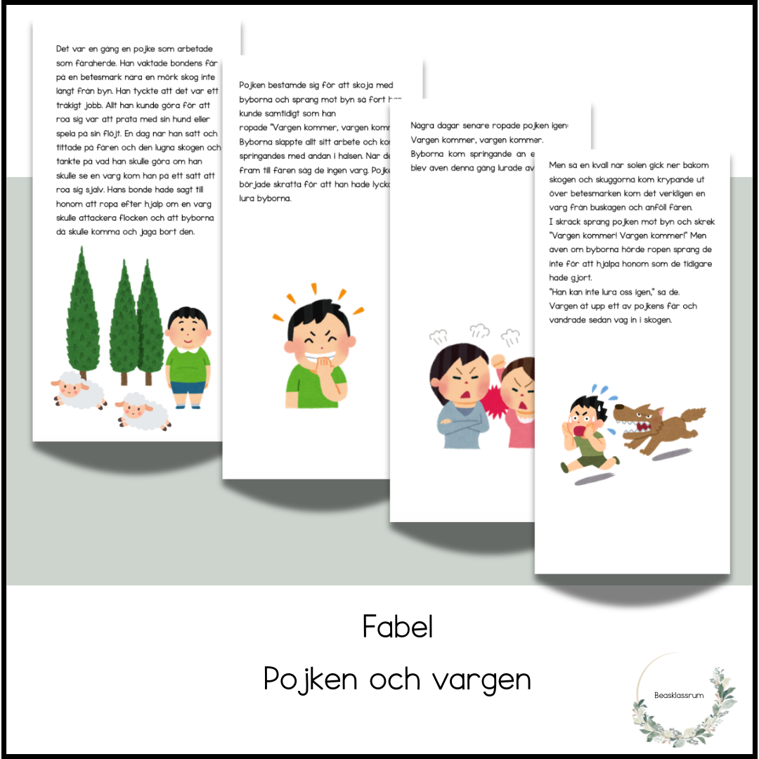 Materialet skrivs ut dubbelsidigt och blir en broschyr med fabeln samt läsförståelsefrågor.