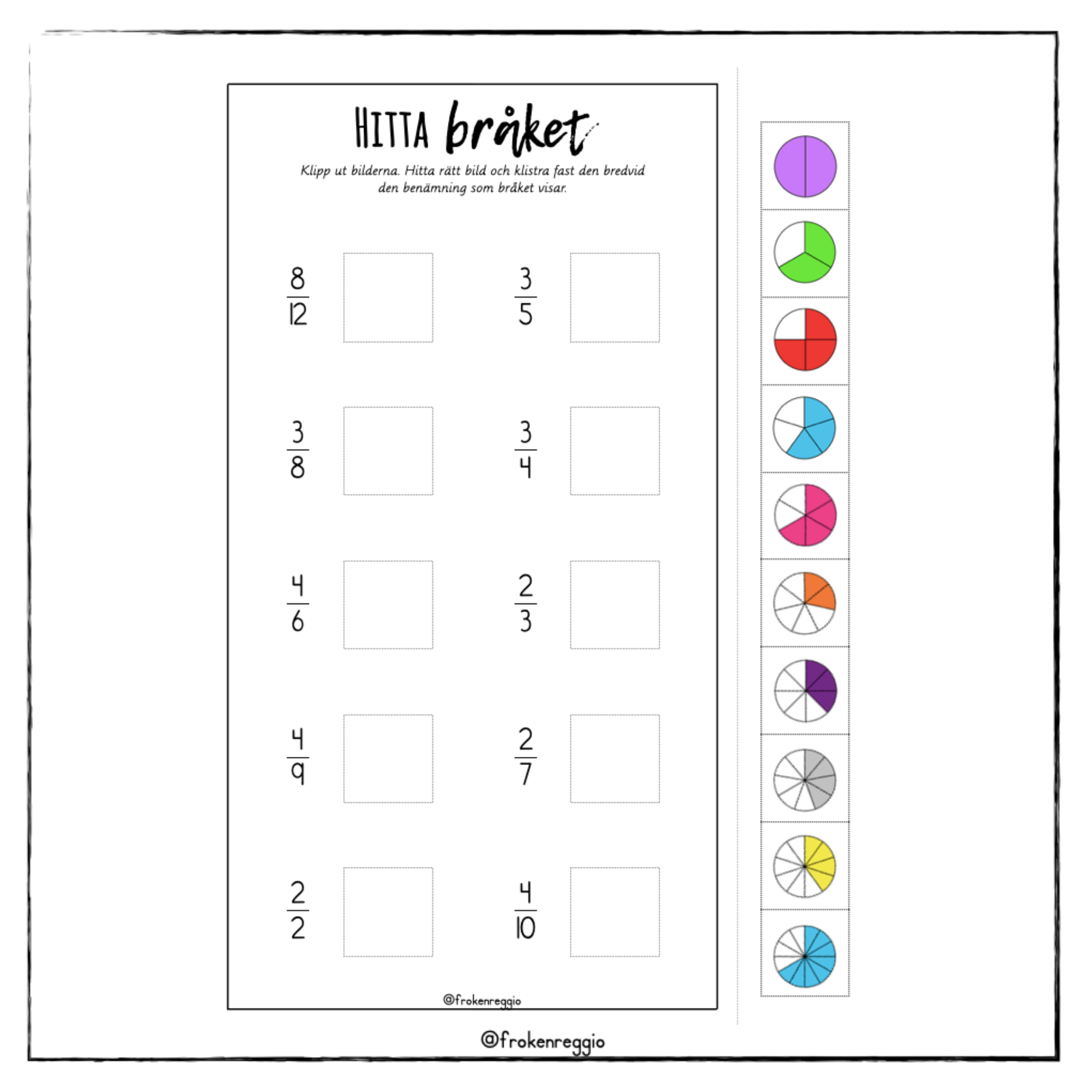Klipp ut bilderna. Hitta rätt bild och klistra fast den bredvid den benämning som bråket visar.