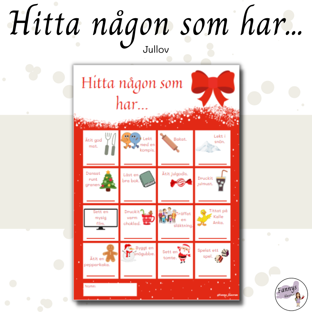 Ett mingelbingo där eleverna får leta efter kompisar som gjort olika aktiviteter under jullovet.