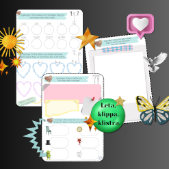 Flera olika arbetsblad med uppdrag där eleverna ska hitta bokstäver, högfrekventa ord, bilder till bokstavsljud, göra egna meningar, rimord till bilder, eget collage. Eleverna tränar även finmotorik med saxen, och materialet öppnar upp till dialoger i klassrummet.