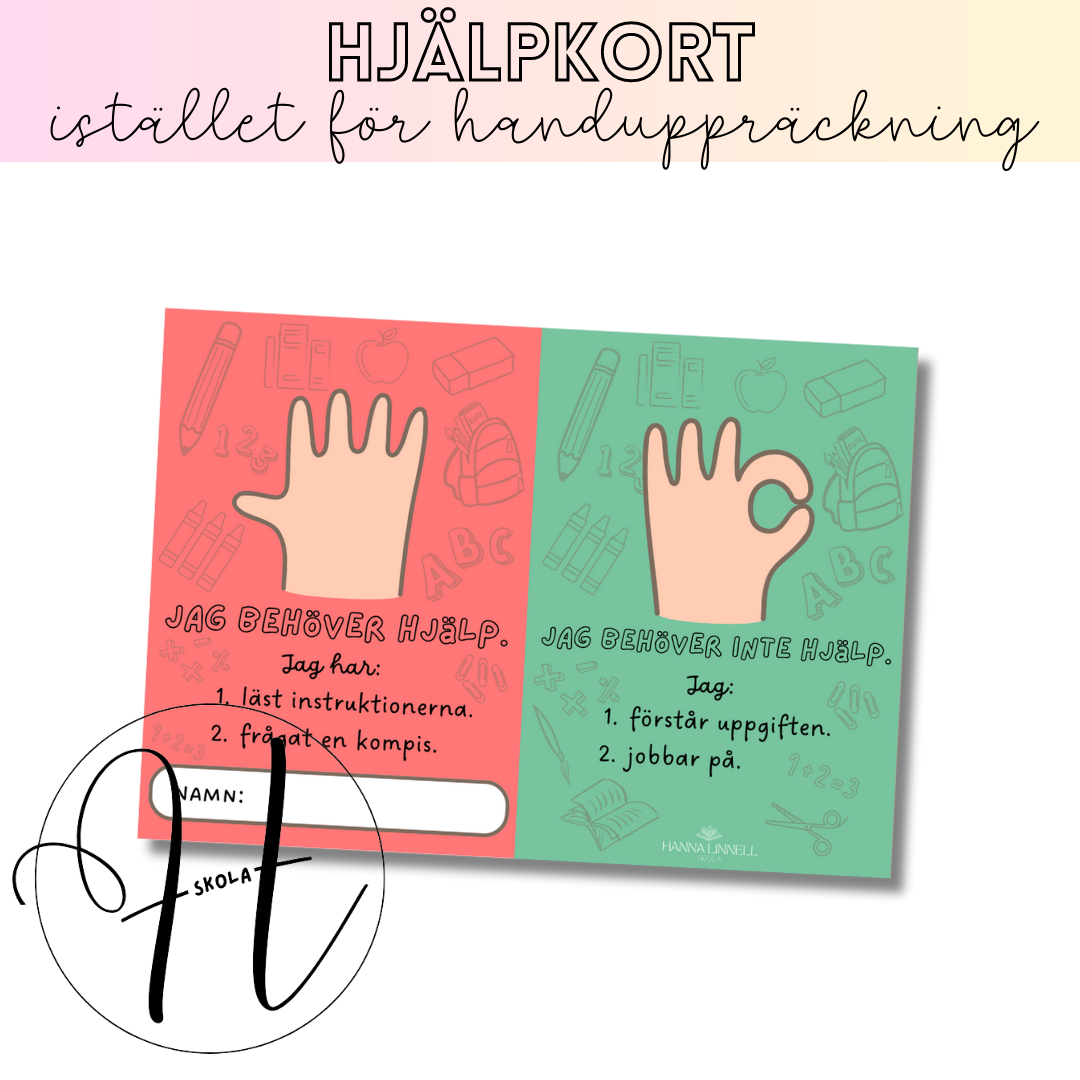 Håll eleverna aktiva under lektionstid med hjälp av dessa hjälpkort. Istället för att räcka upp handen, och passivt vänta på att läraren ska komma och hjälpa till med en uppgift, kan eleverna vända på kortet på sin bänk eller tyst smyga och lämna det i lärarens hand. Under tiden eleven väntar på hjälp kan den fortsätta med en annan uppgift eller försöka vidare på egen hand. Då eleven lämnar kortet i handen på läraren blir också ordningen som eleverna blir hjälpta mer rättvis.