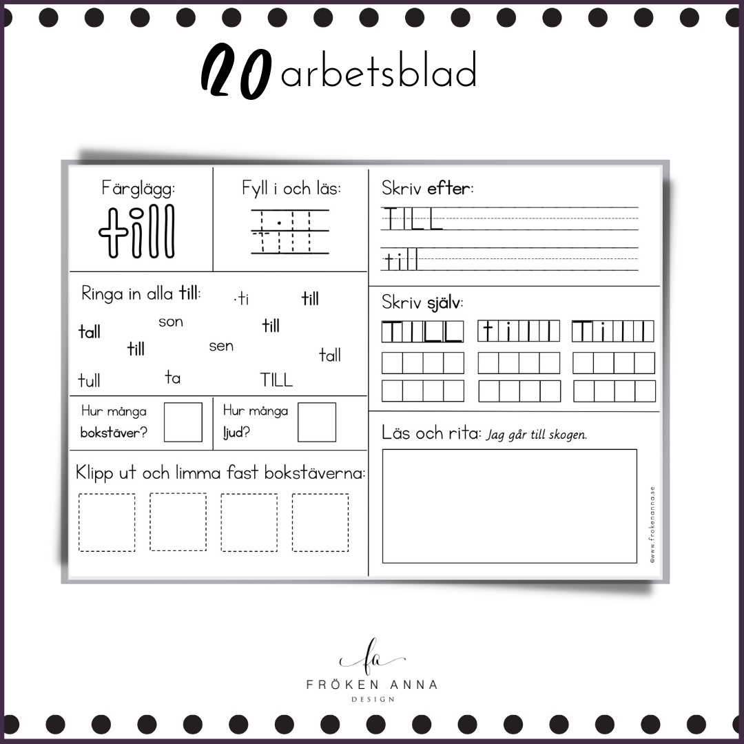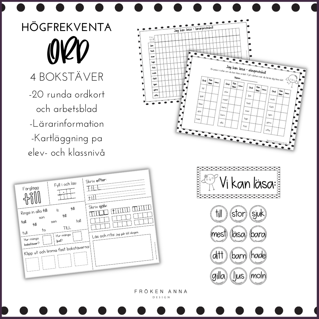 - 20 arbetsblad med högfrekventa ord beståendes av tre bokstäver