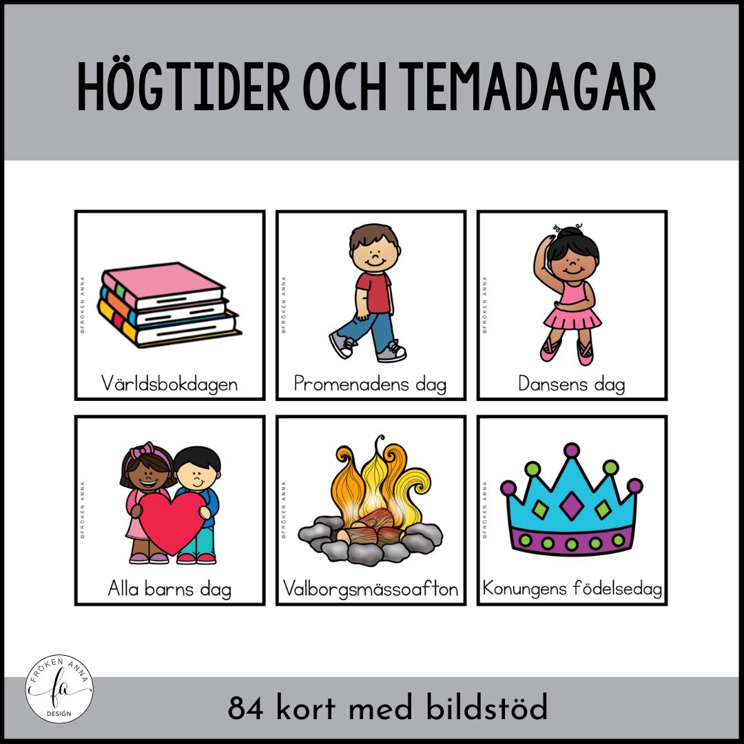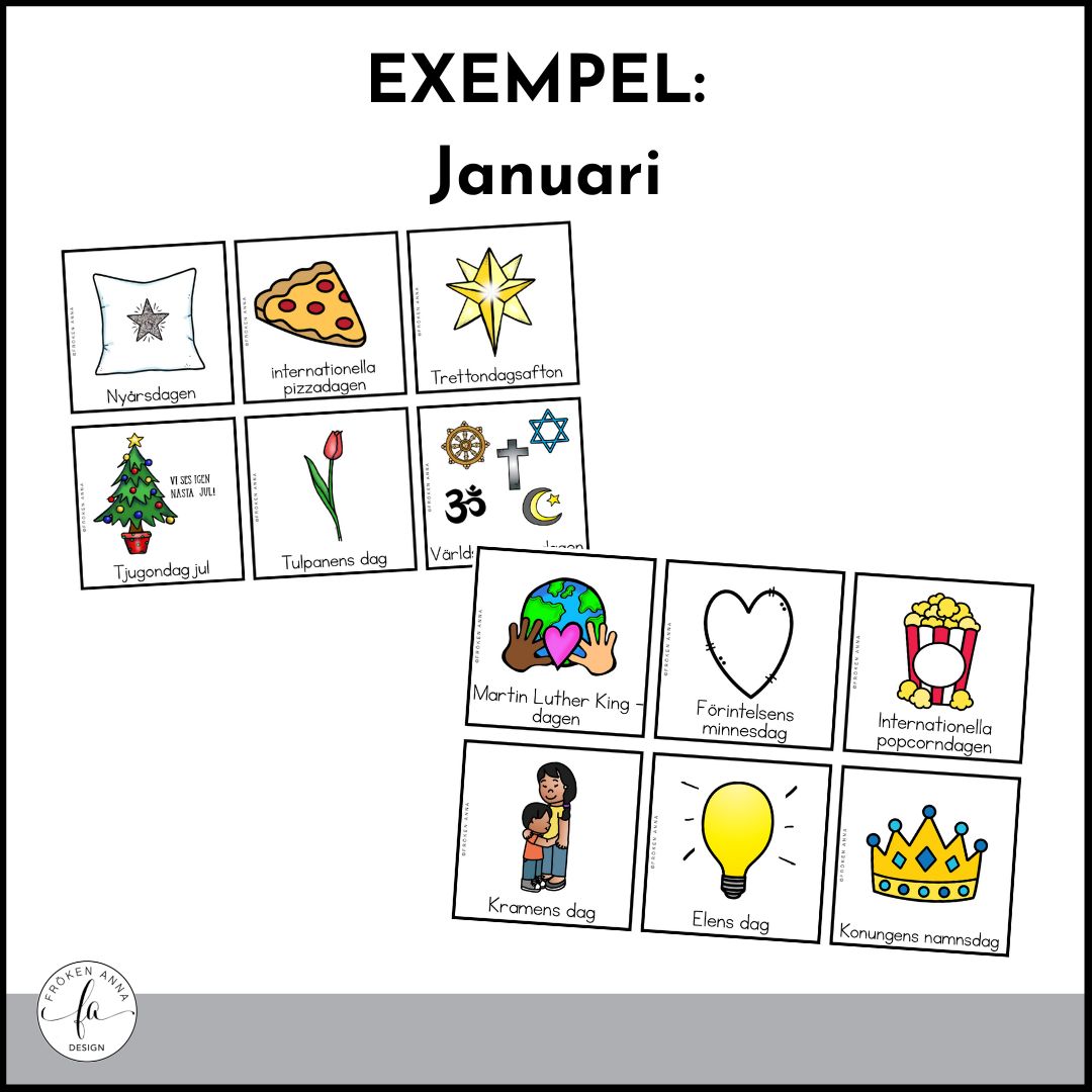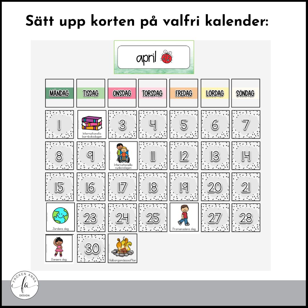 84 småkort med årets alla högtider och temadagar att sätta upp på valfri kalender för att synliggöra månadens aktuella datum.