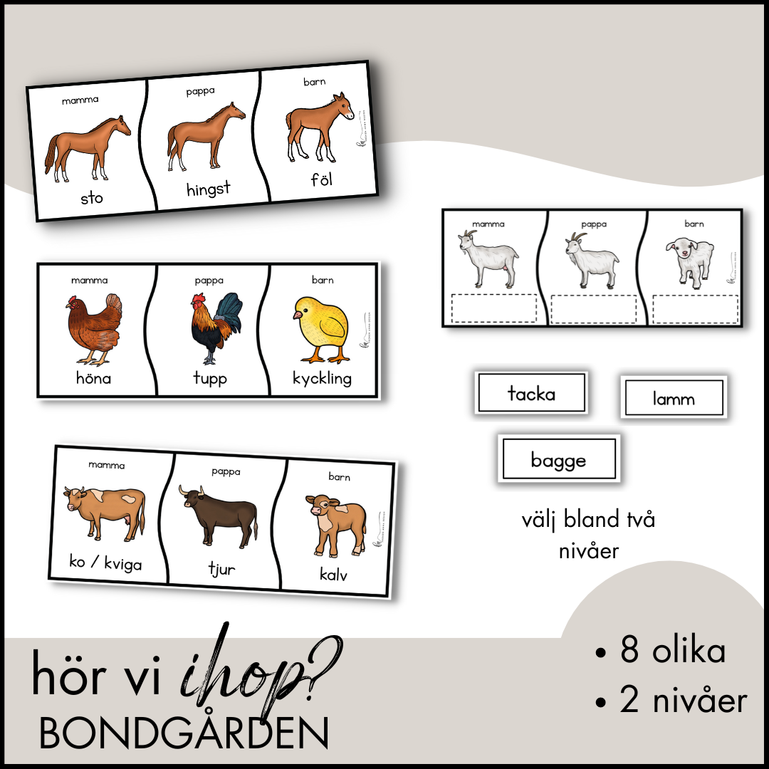 Lär barnen om bondgårdens djur på ett roligt och interaktivt sätt med detta pedagogiska material där de får para ihop namn på djurens familjemedlemmar – mamma, pappa och barn. Materialet hjälper barnen att lära sig vad olika djur kallas beroende på kön och ålder, samt särskilda termer för vissa djur. En engagerande aktivitet som kombinerar lek och lärande och utvecklar barnens språkkunskaper och förståelse för djurens värld.