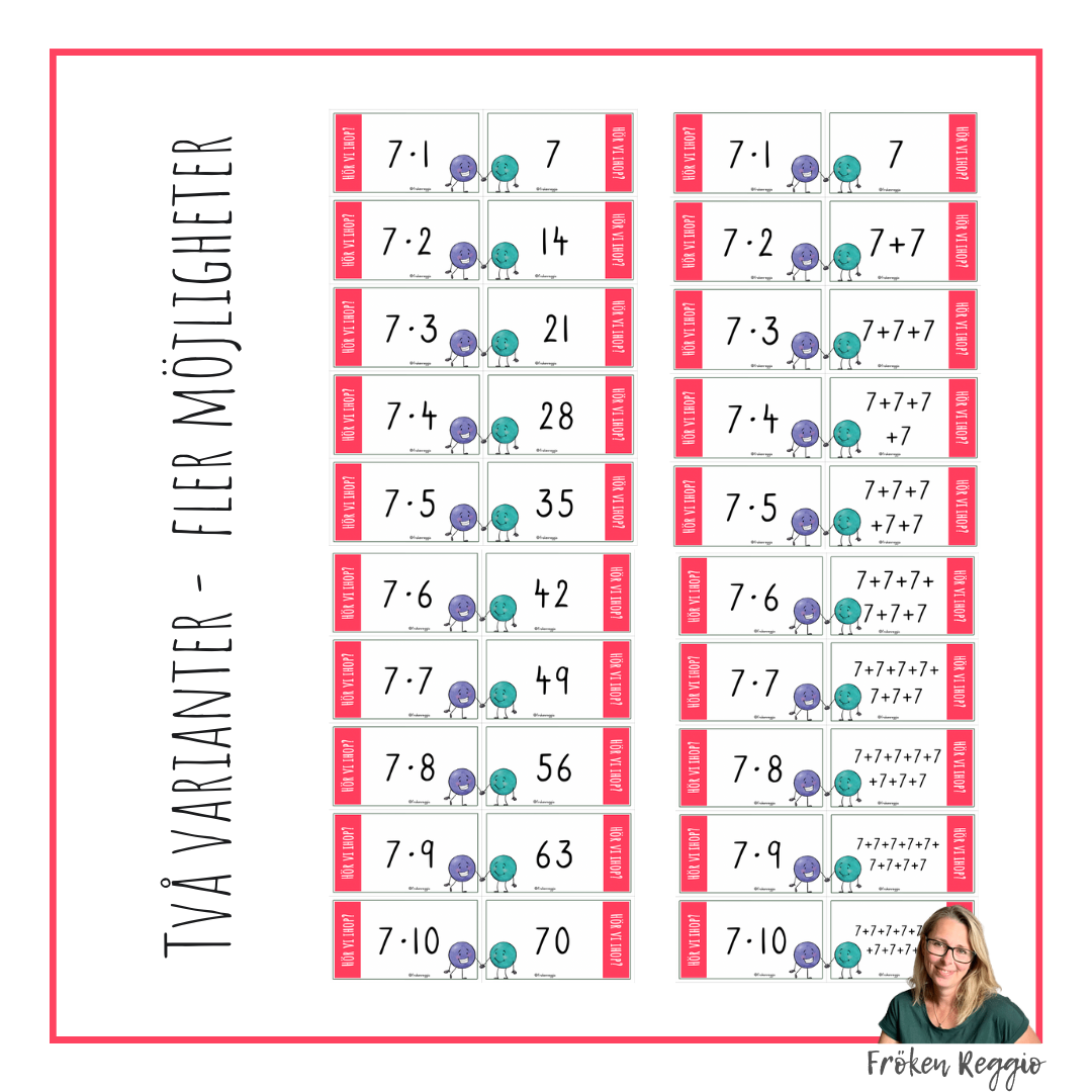 Materialet innehåller två varianter med totalt 40 kort för att träna 7:ans tabell: Koppla multiplikationen med rätt svar eller multiplikationen med rätt upprepad addition. Det skapar även möjligheten att para ihop tre kort: multiplikationen + rätt svar + upprepad addition.