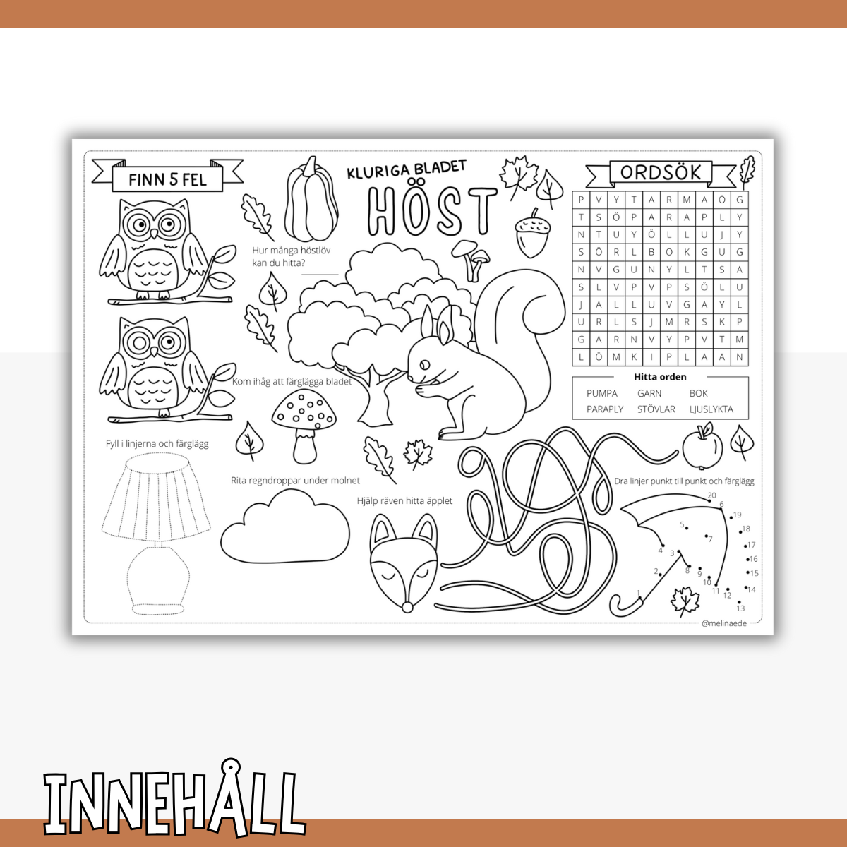Klurigt blad med tema höst. Rita, räkna, färglägg, finn fem fel, punkt till punkt, ordsök med mera.