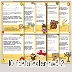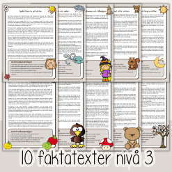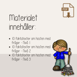 Materialet innehåller tio olika teman som har med hösten att göra. Varje ämne har en lästext med tillhörande frågor. Materialet finns i tre olika nivåer – Nivå 1: Mycket lättläst, Nivå 2: För elever som kommit igång med läsningen, Nivå 3: För elever som läser bra.