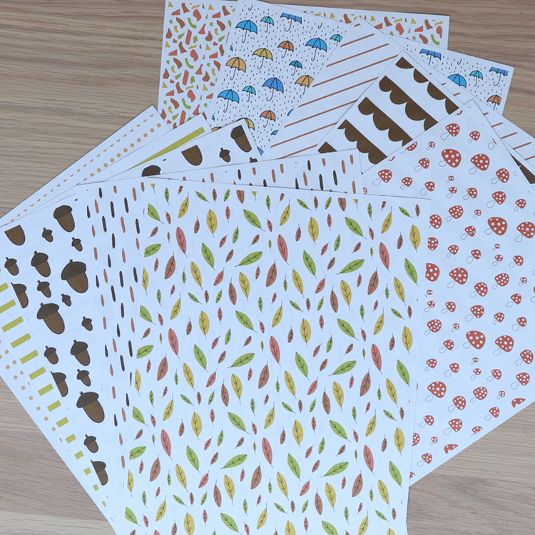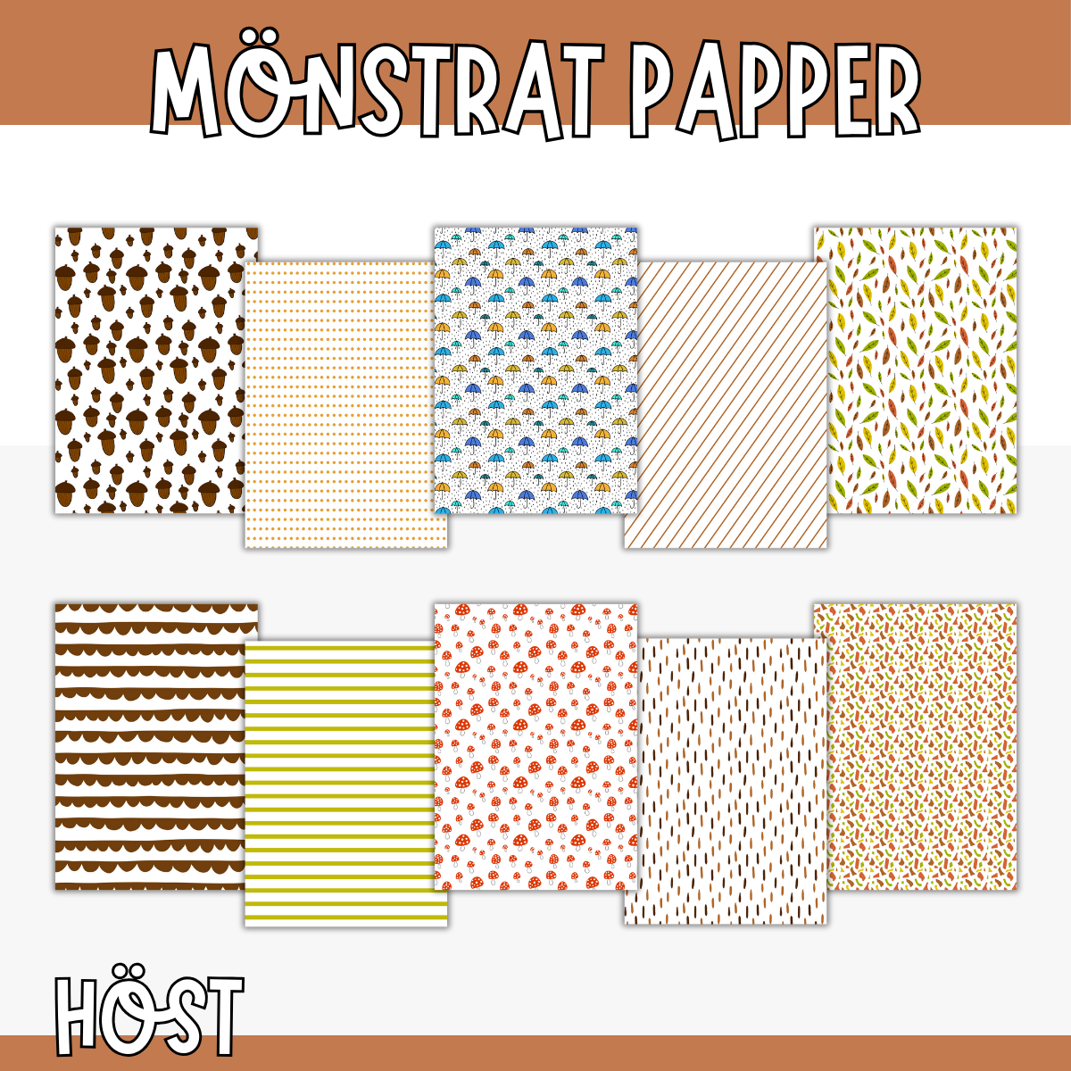 Höstpyssla med mönstrat papper. Innehåller 10 papper med hösttema. Motiv: flugsvampar, paraplyer, ekollon, löv, geometriska former, streck, randigt (grön och vit), randigt (brun och vit), prickigt, bruna vågor/bubblor.
