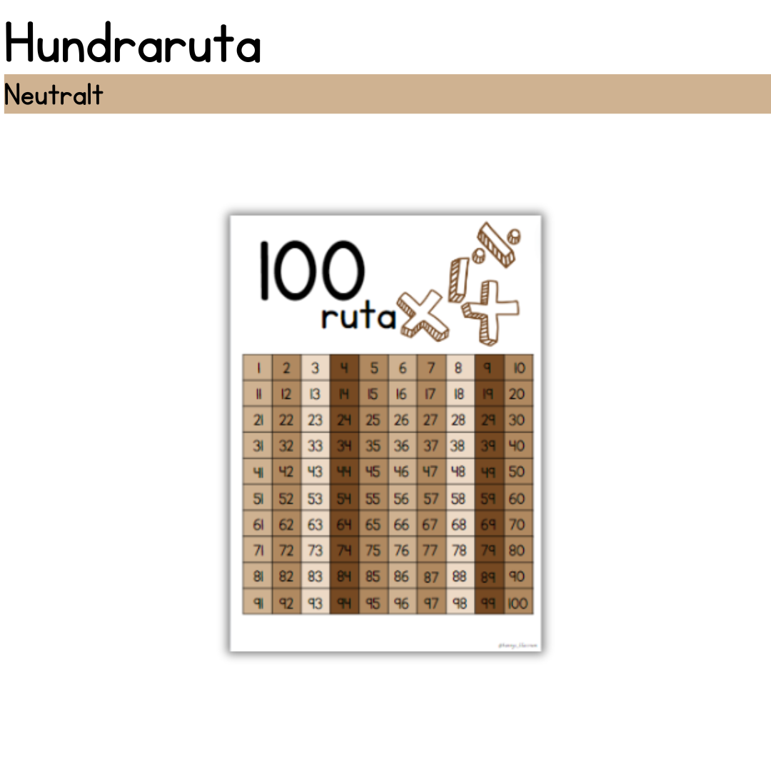 100 ruta som antingen kan lamineras i små varianter som eleverna kan ha själva eller stor och sättas upp på väggen. Ingår i mitt neutrala klassrumspaket.
