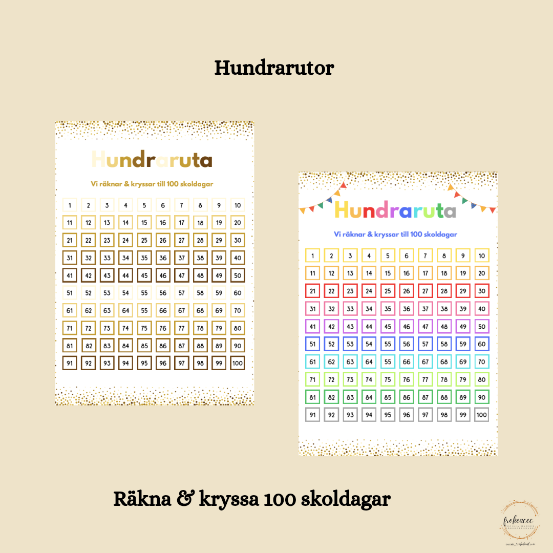 2 hundrarutor i olika färgsättningar. Räkna och kryssa till 100 skoldagar.