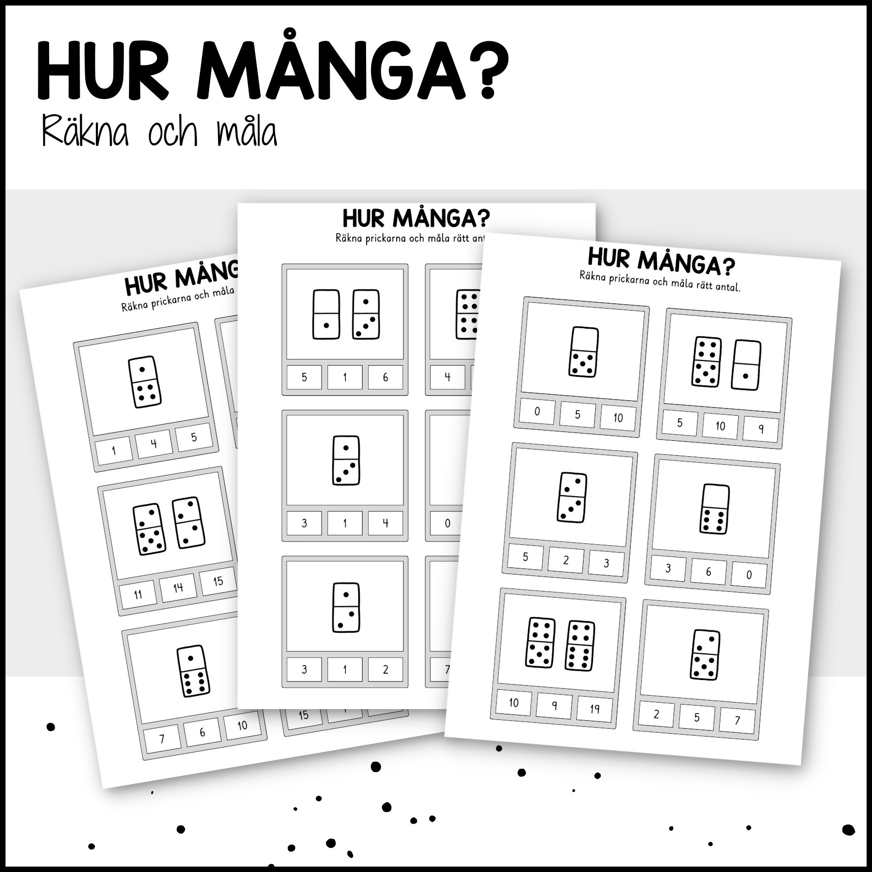 5 arbetsblad där eleven ska räkna och måla rätt antal. Går också att klippa ut och laminera för att använda som nypkort.