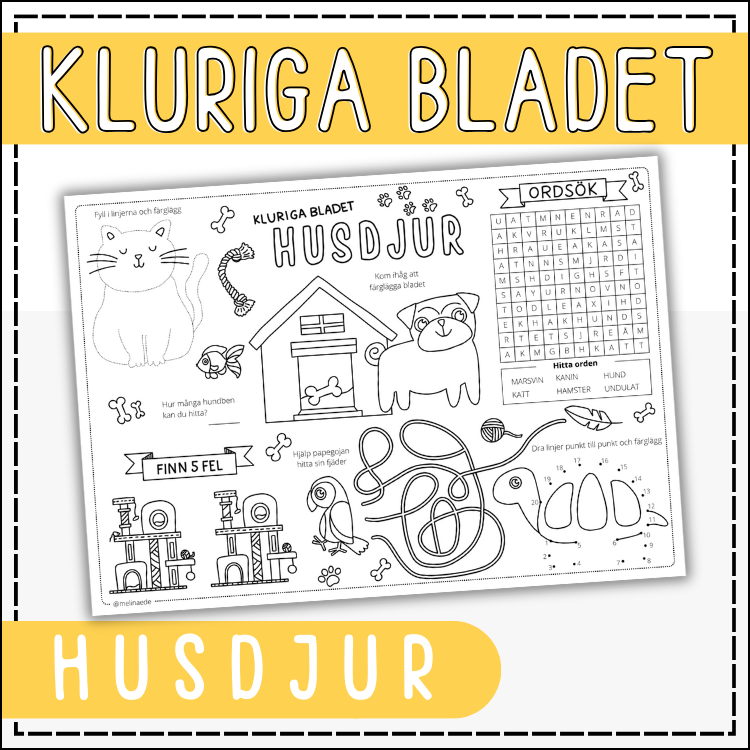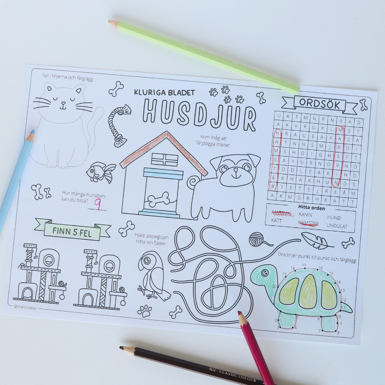 Klurigt blad med tema husdjur. Rita, räkna, färglägg, finn fem fel, punkt till punkt, ordsök med mera.