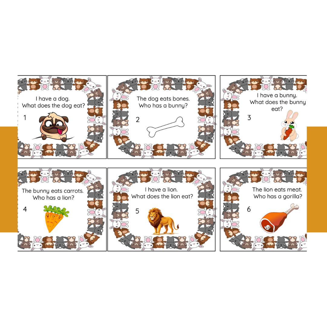 26 kort där eleverna kan träna på enkla engelska meningar, den här gången med vad djur och vad de äter! Bra sätt att träna muntligt i klassrummet.