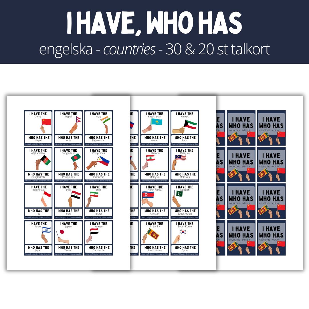 I have who has, ordkejda. Talövning där eleverna får utveckla sina språkliga kunskaper i det engelska språket. Spelet innehåller två alternativa ordkedjor, ett alternativ med 30 talkort och ett med 20 talkort. Temat på begreppen är länder i Asien. Till varje begrepp finns en bild. I have who has är ett roligt sätt att repetera eller lära sig nya begrepp på. Ordkedjan stärker även eleverna i att våga prata inför en mindre grupp eller hela klassen.