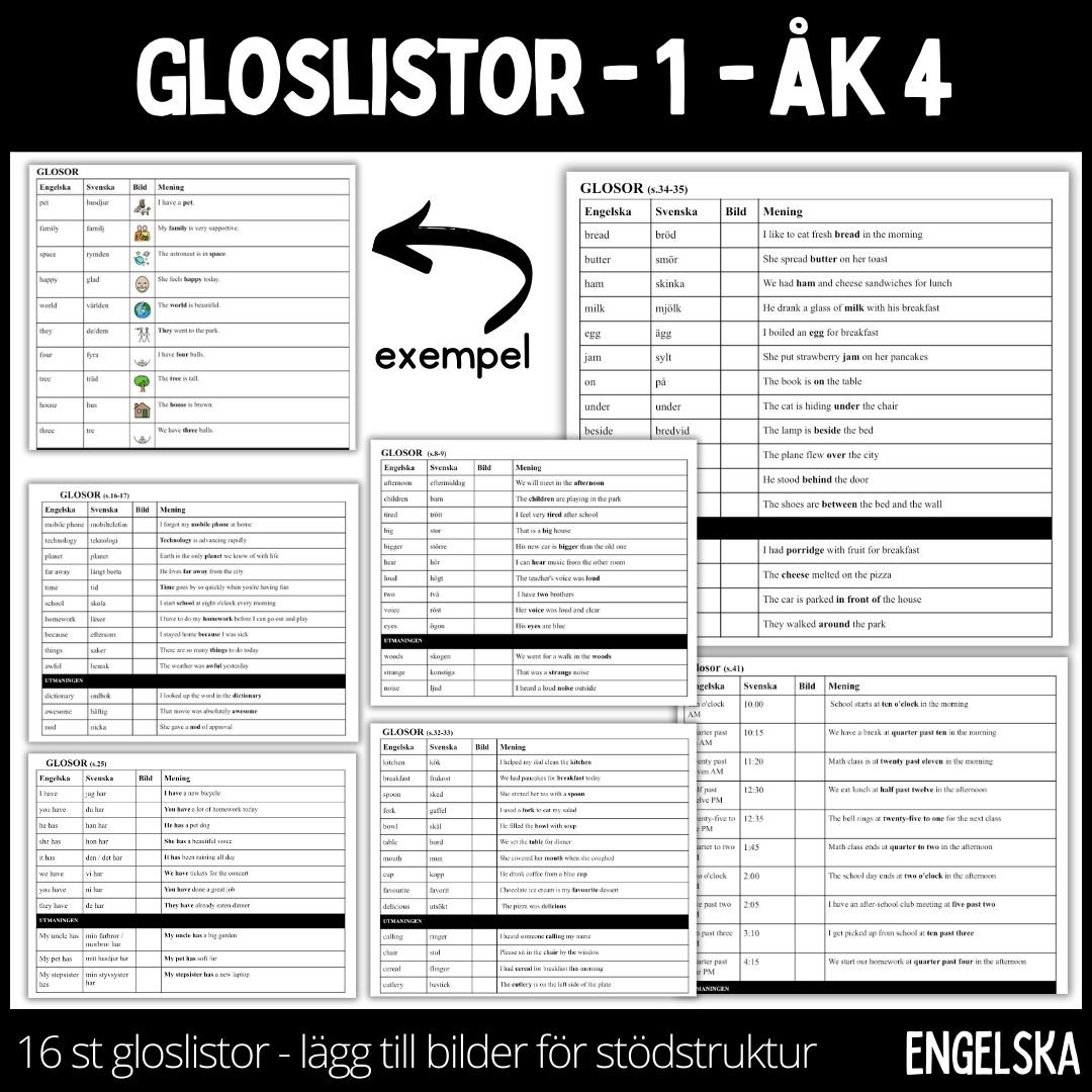 16 färdiga gloslistor som är redigeringsbara. När jag gjort materialet har jag utgått från första delen i läromedlet SKILLS åk4. Lägg till bildstöd i kolumen ”bild” för att ge eleverna extra stöttning i sin lärprocess.