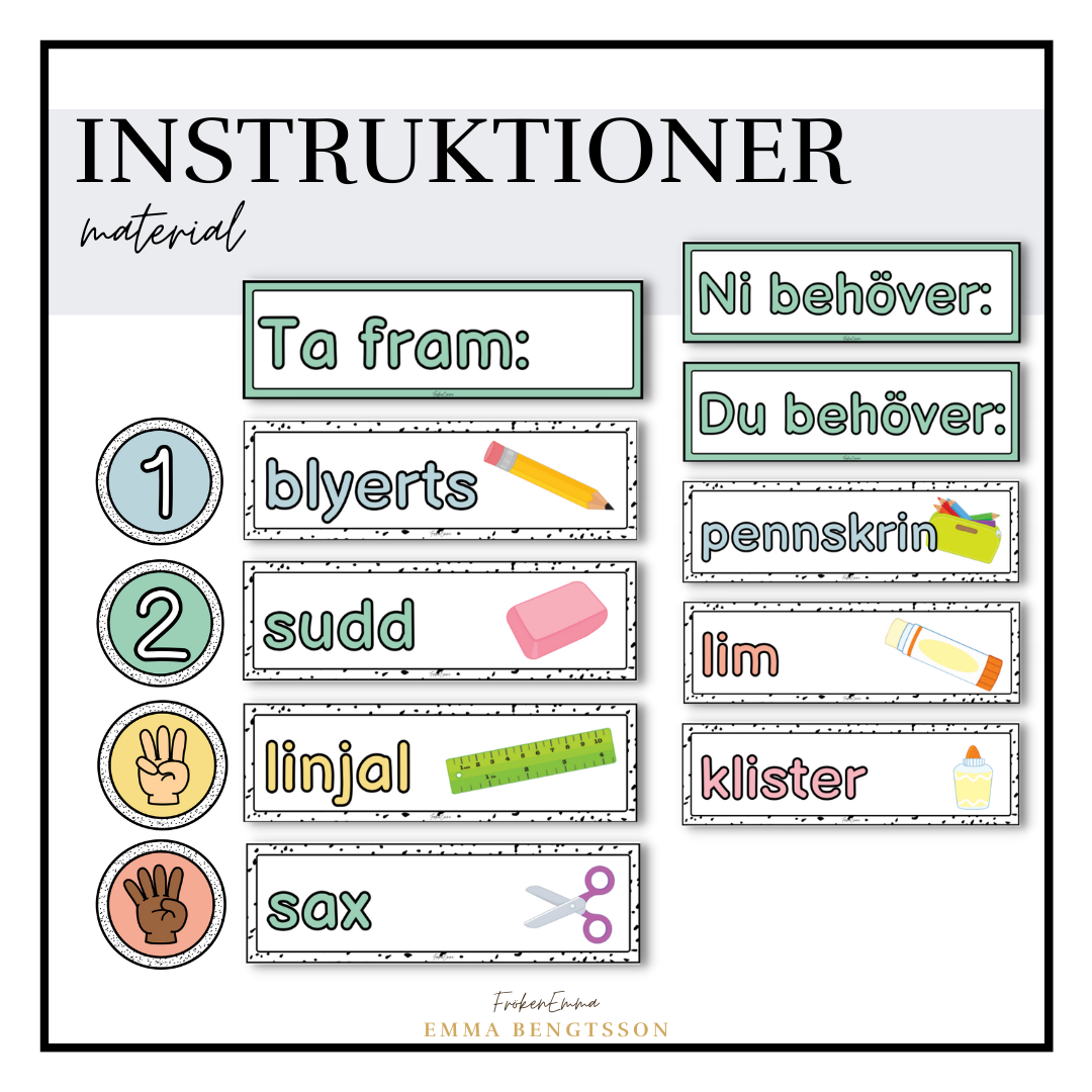 Materialet innehåller 57 olika “materialskyltar”, siffrorna 1-10, 1-5 med händer och skyltarna “ta fram”, “du behöver” och “ni behöver”.