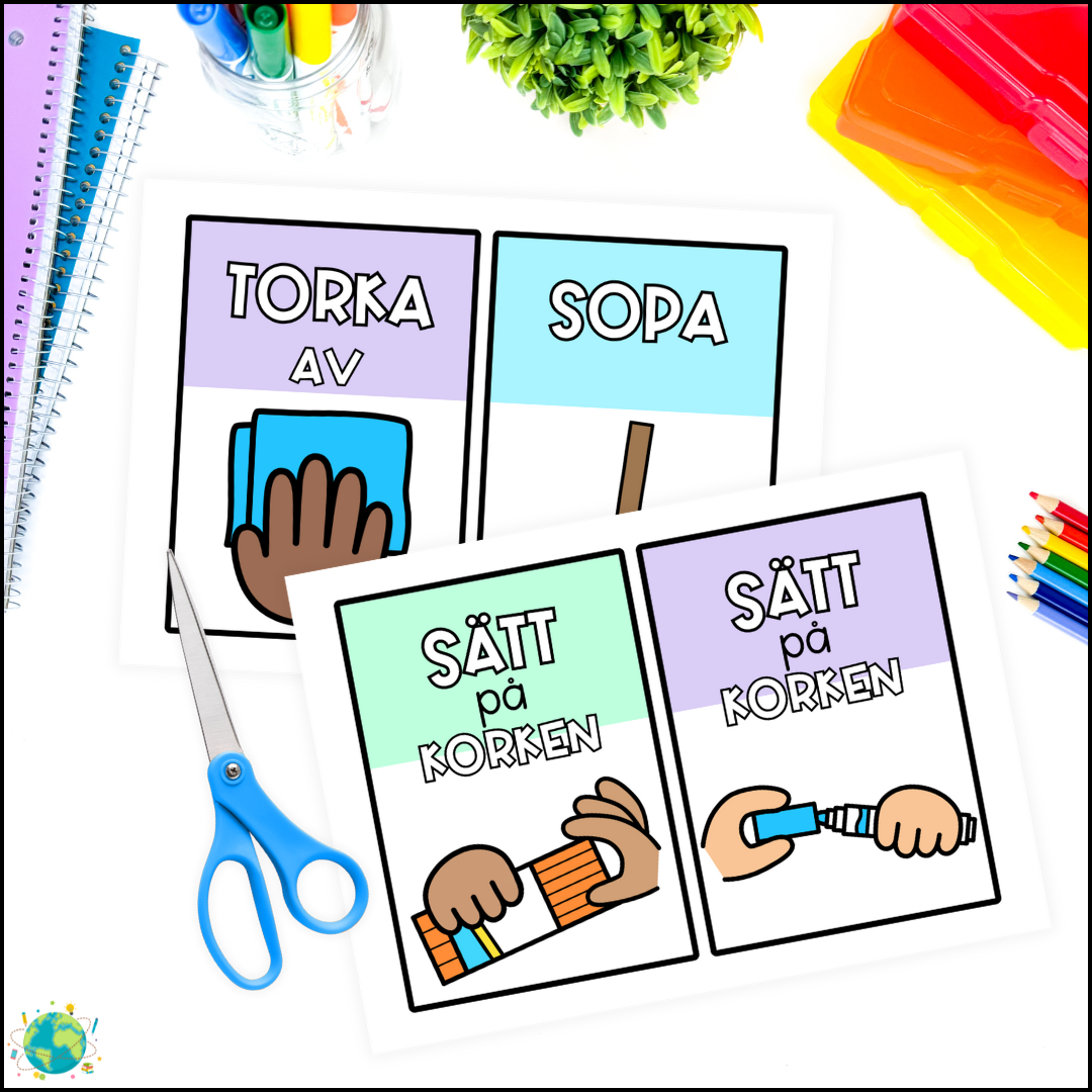 Mjuka och inbjudande instruktionskort i pastellfärger som skapar en lugn och vänlig atmosfär i klassrummet. Färgerna gör instruktionerna tydliga men behagliga för ögat, vilket passar extra bra för yngre barn.