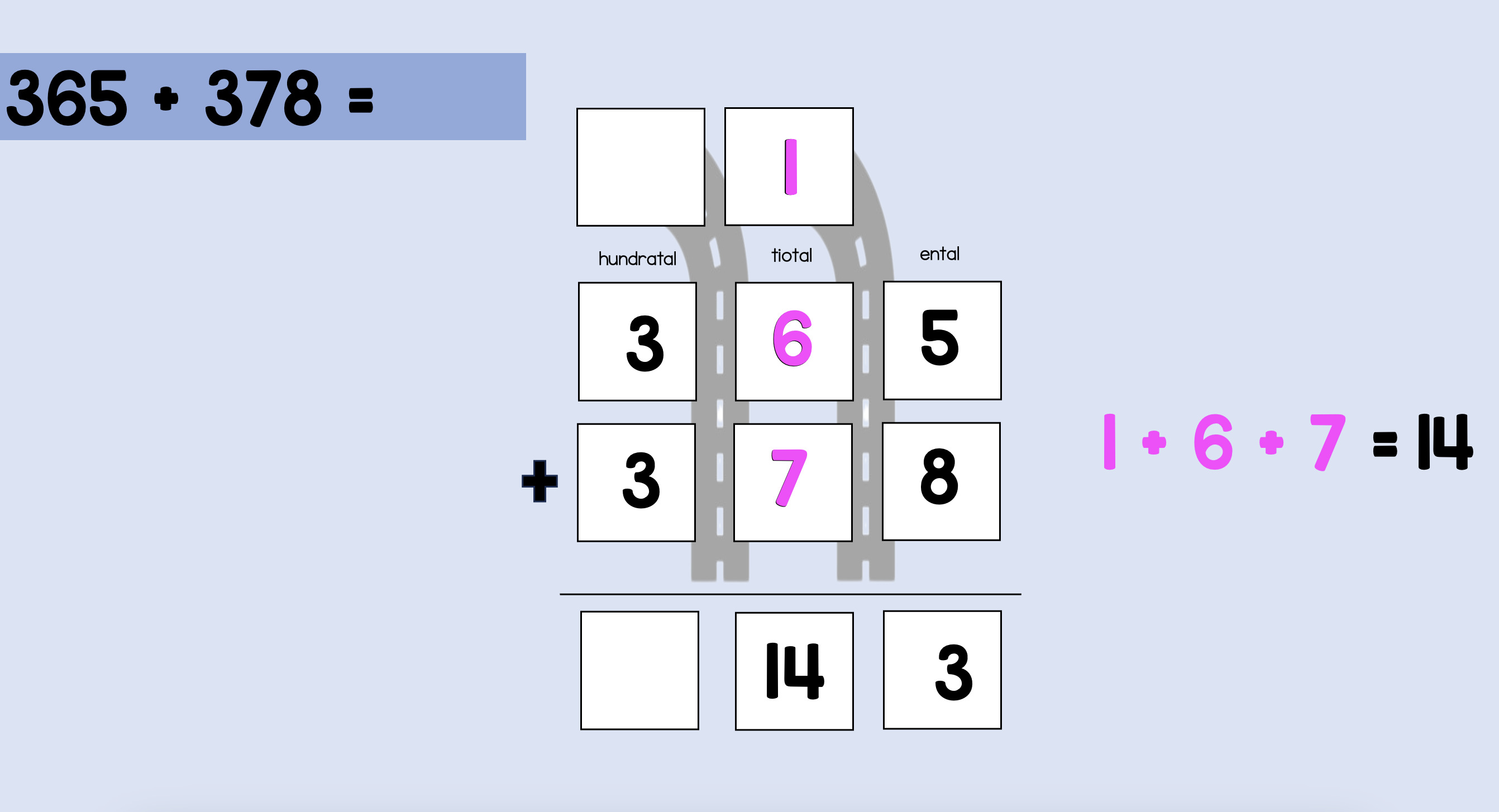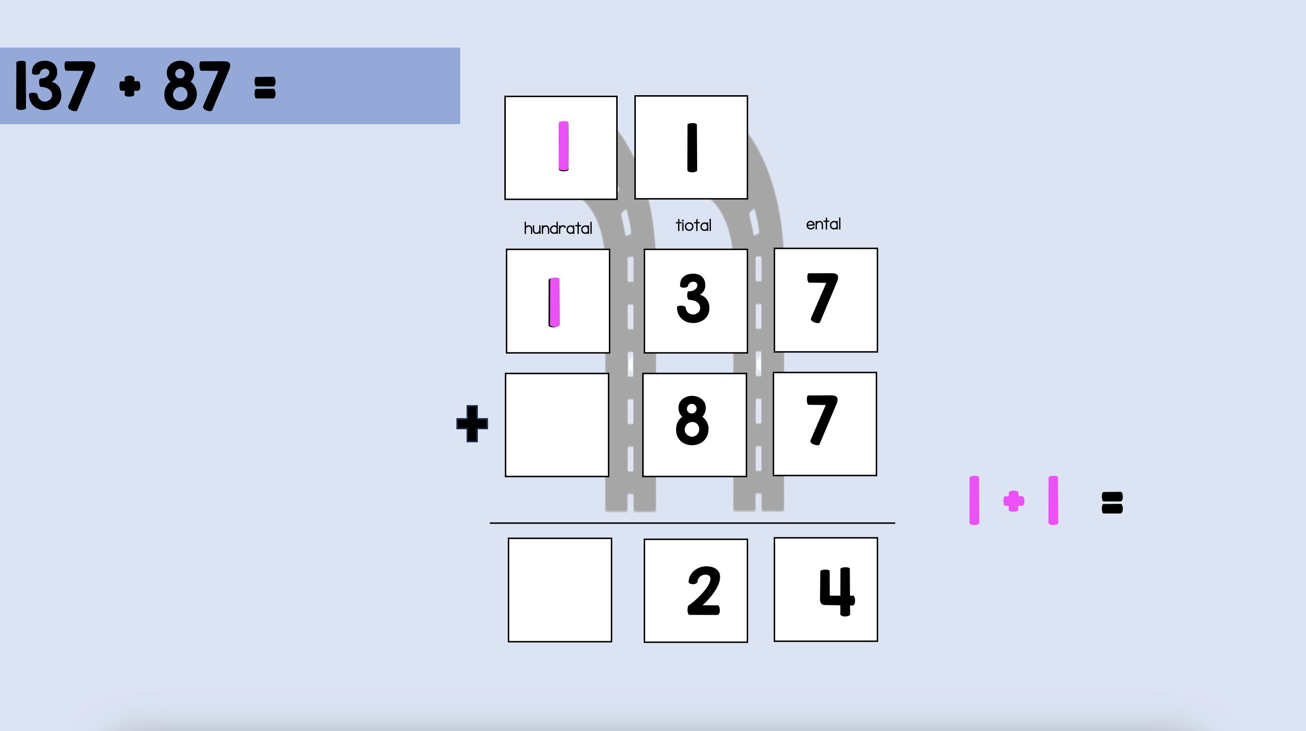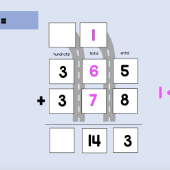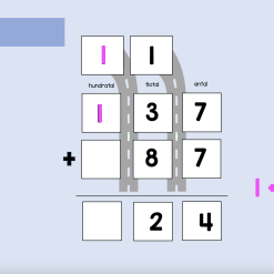 Interaktiv presentation av uppställning av addition med övergång, 2 minnessiffror.
