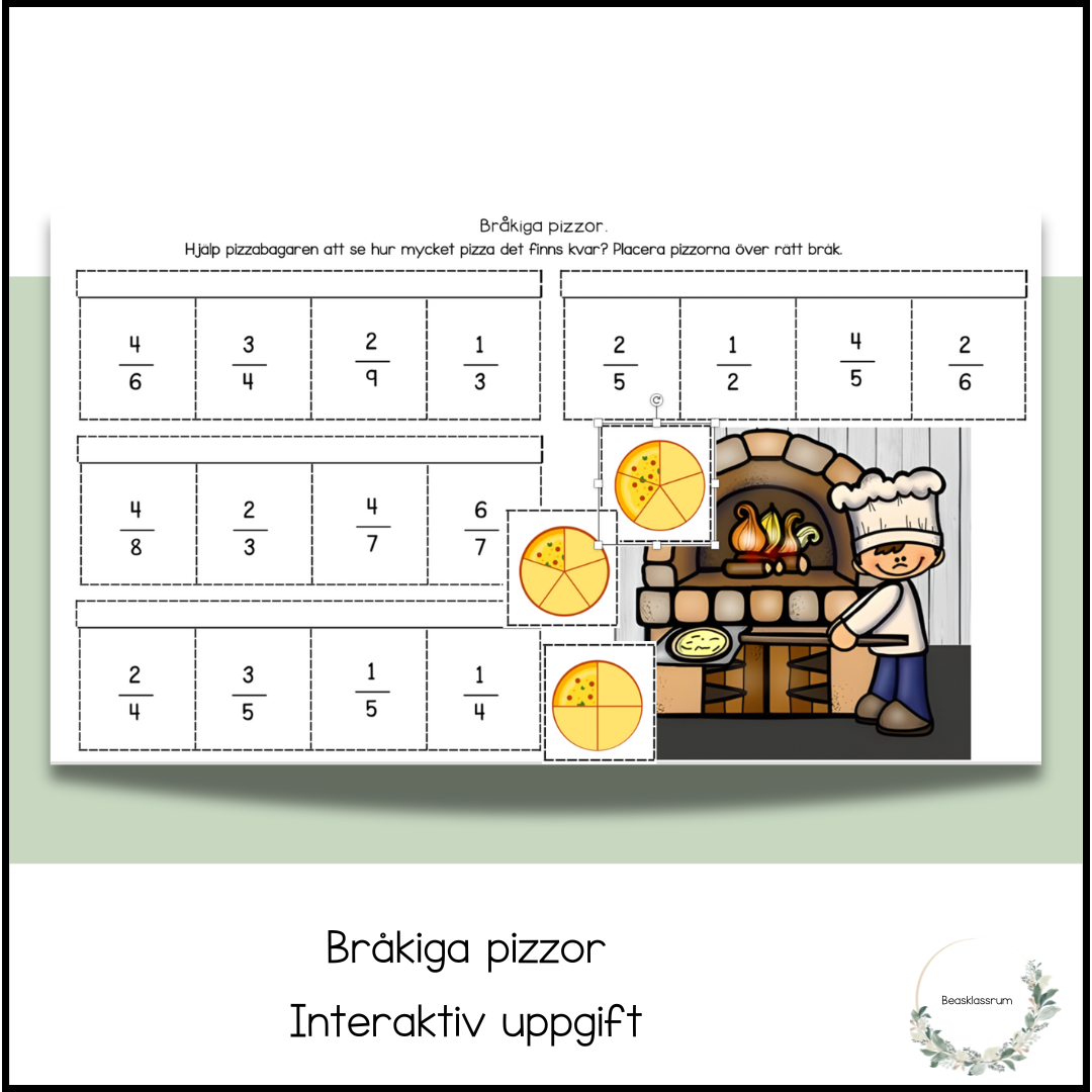 Eleverna får i uppgift att placera pizzorna på rätt bråk genom att dra dem till rätt plats.