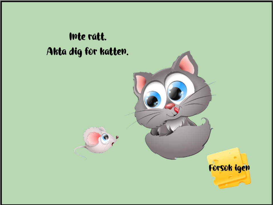 Eleverna trycker på den ostskiva som de tror är rätt, är svaret rätt skickas de till en ny uppgift. Är svaret fel skickas man tillbaka till första sidan och får öva en gång till.