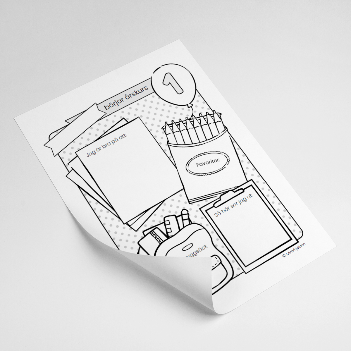 På banderollen finns plats för barnets namn. Ryggsäcken är tänkt att eleverna ska använda för att färglägga hur deras ryggsäckar ser ut. Där det står självporträtt eller så här ser jag ut kan du antingen låta eleverna rita en bild eller klistra in ett foto. Där det står favoriter kan eleven rita eller skriva sina favoritsaker, ex. favoritfärg, favoritdjur, favoritbok etc.