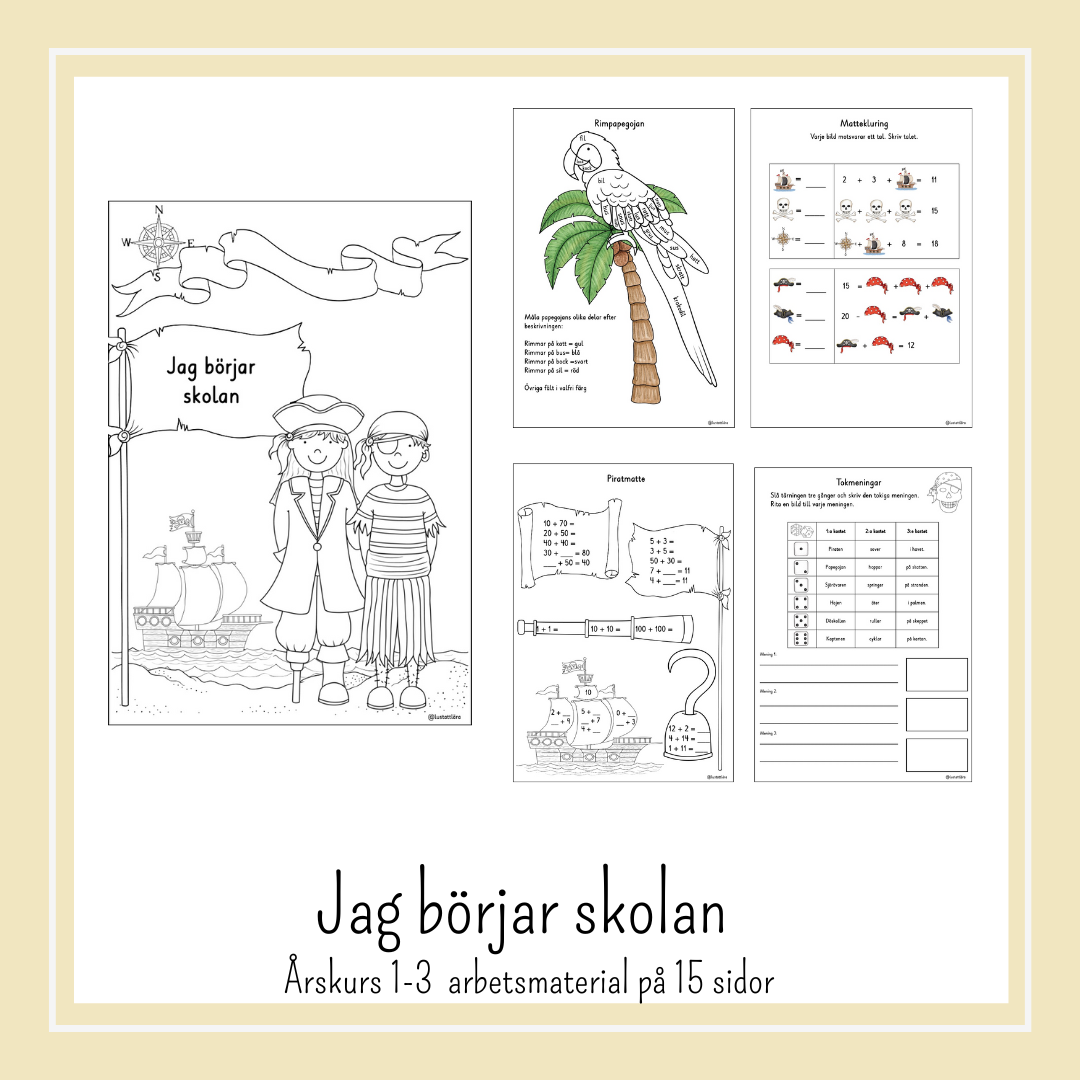 Ett arbetshäfte på 15 sidor med blandade uppgifter inom matematik och svenska. Har pirattema på hela häftet.