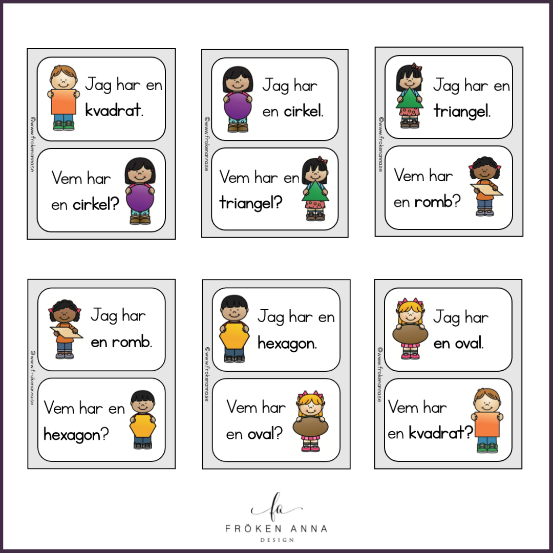 Träna på formernas namn i grupper om sex barn / elever per grupp. Ta ett kort var och gå varvet runt. (Börja med vallfritt kort)