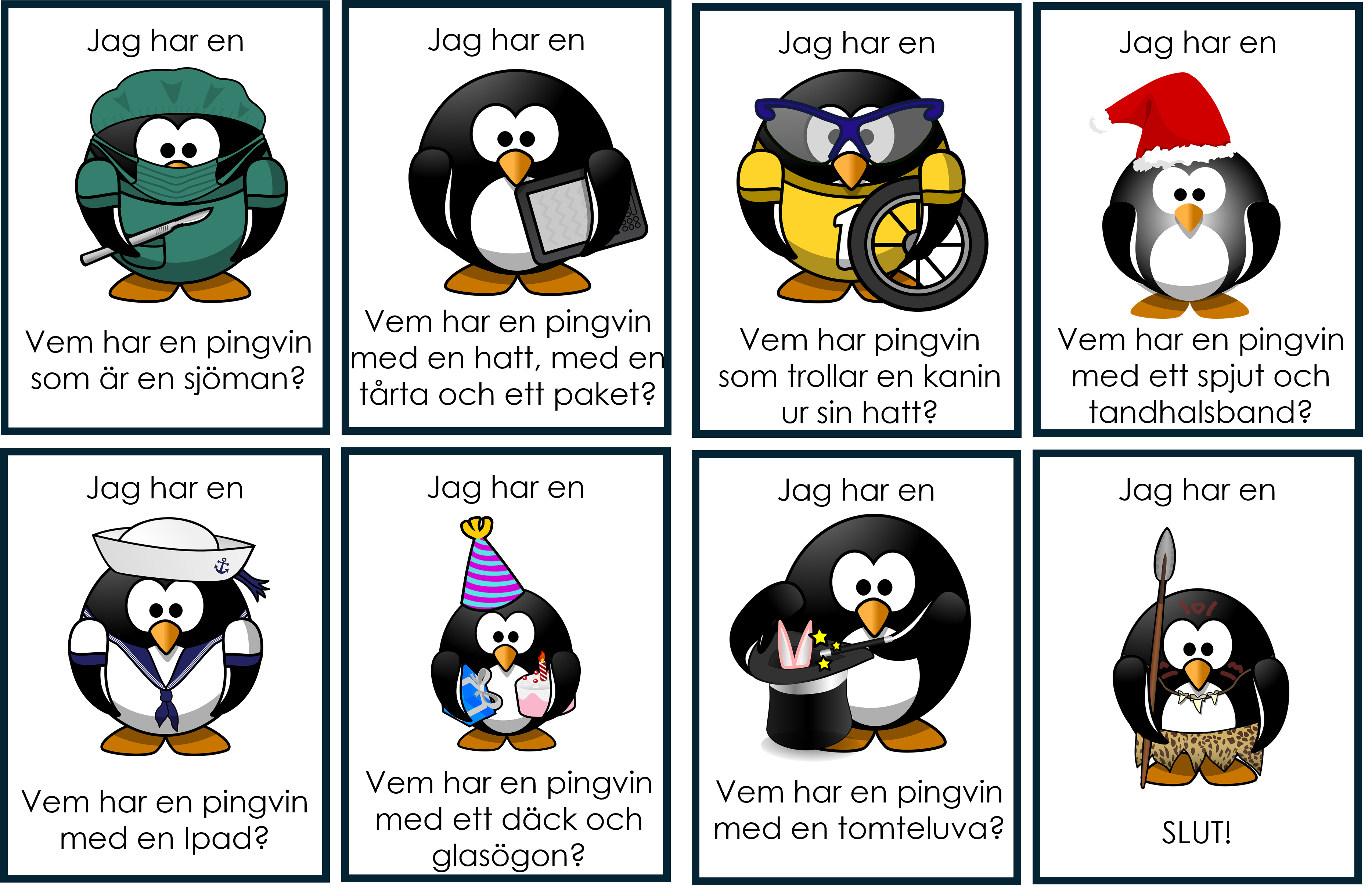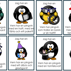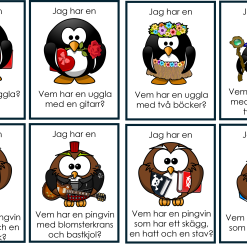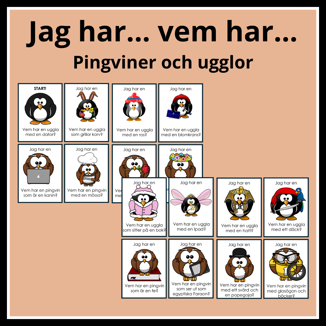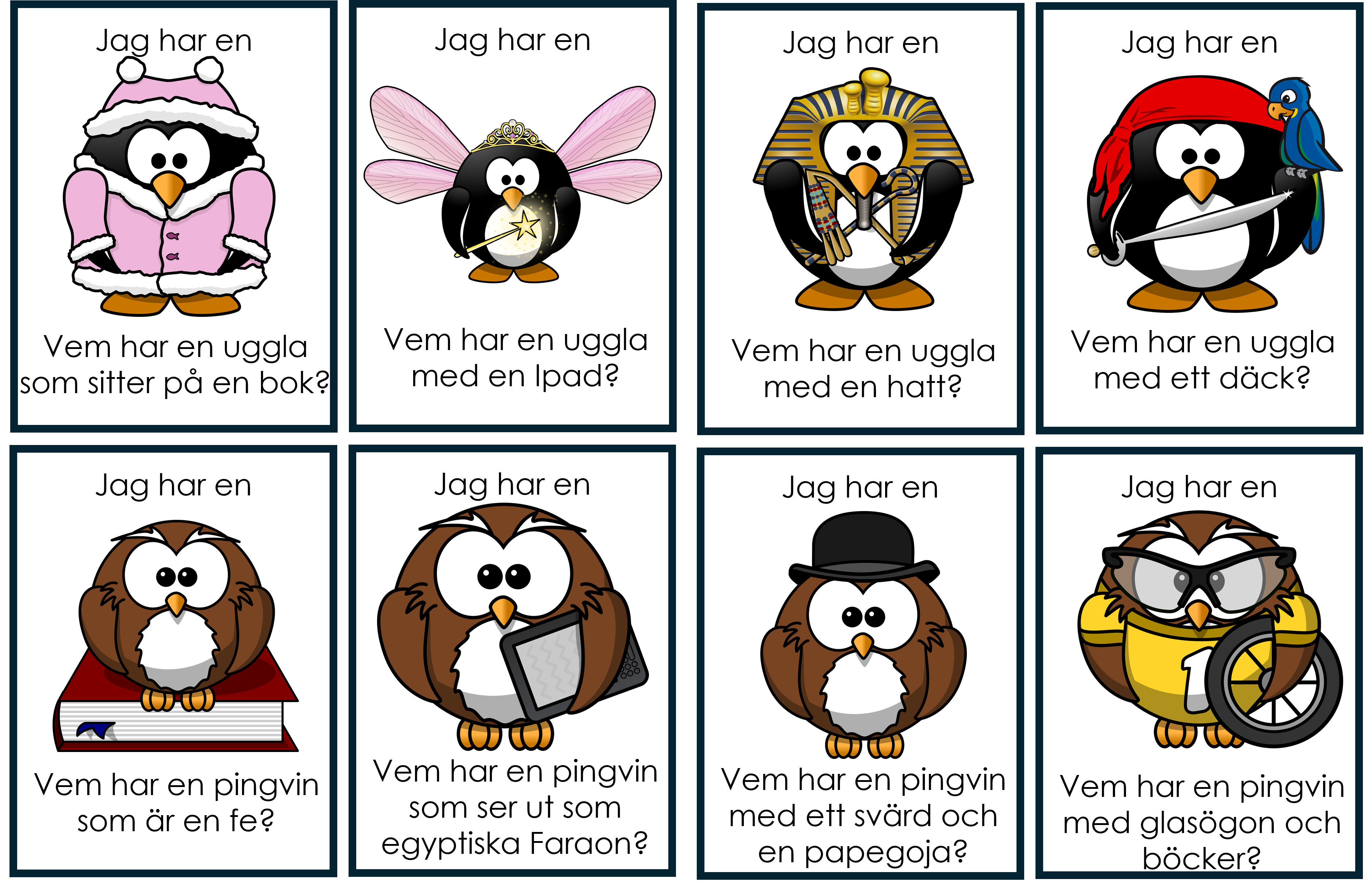 Materialet innehåller 32 kort med ugglor och pingviner.