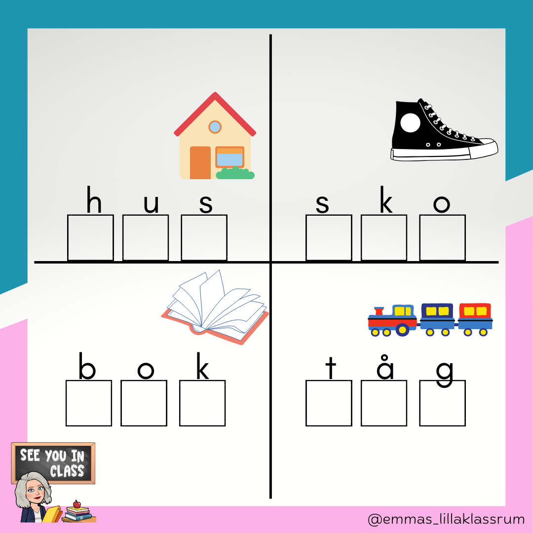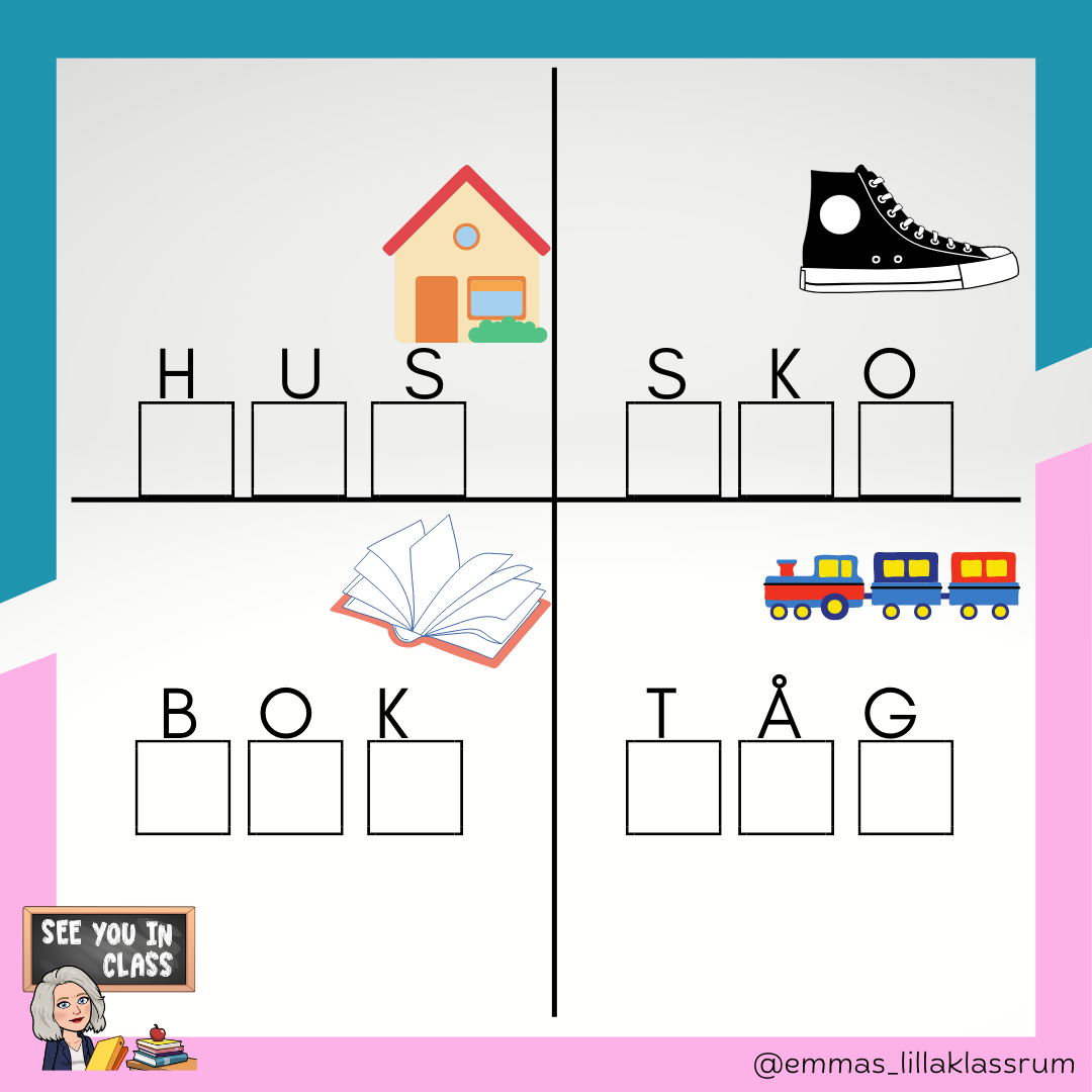 Detta material består av bilder och tillhörande ord. Det kan användas på olika sätt. En tanke är att eleverna skriver av ordet i rutorna eller att man utmanar att eleverna ska skriva ordet fast med små bokstäver. Ett enklare altivernativ är att klippa ut bokstäverna och klistra in eller lägga de på rätt plats. Eller på de sätt som fungerar just för dina elever.