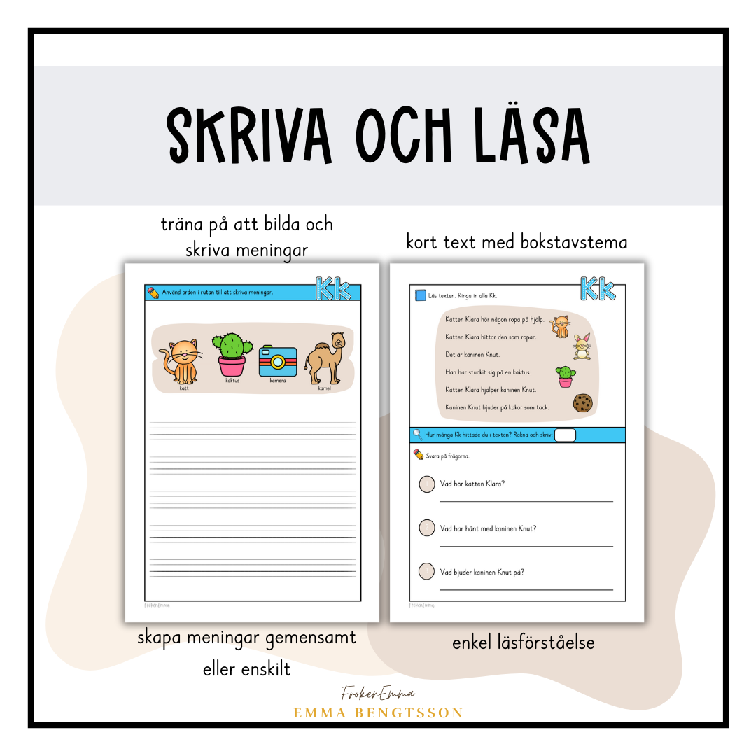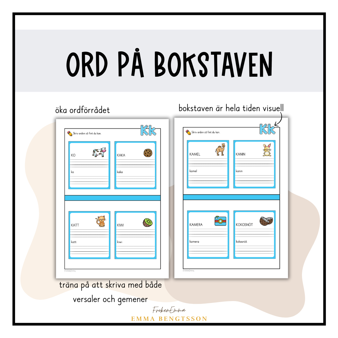 234 sidor med rent bokstavsarbete! Perfekt som komplement till din bokstavs-undervisning! Arbetsgången i materialet är upplagt på samma sätt för varenda bokstav. Detta gör bokstavsarbetet förutsägbart vilket elever brukar uppskatta då de vet precis vad de ska göra när de väl har lärt känna materialet. Att upplägget är precis samma för varje bokstav kan låta tråkigt för oss lärare då vi kan tänka att variationen försvinner, men enligt min erfarenhet mår många elever bra av förutsägbarheten och kan till och med sakna den när den försvinner. Därav kom idén till materialet då mina tidigare bokstavsarbeten var rena kaoset för vissa elever vilket skapade kaos för mig.