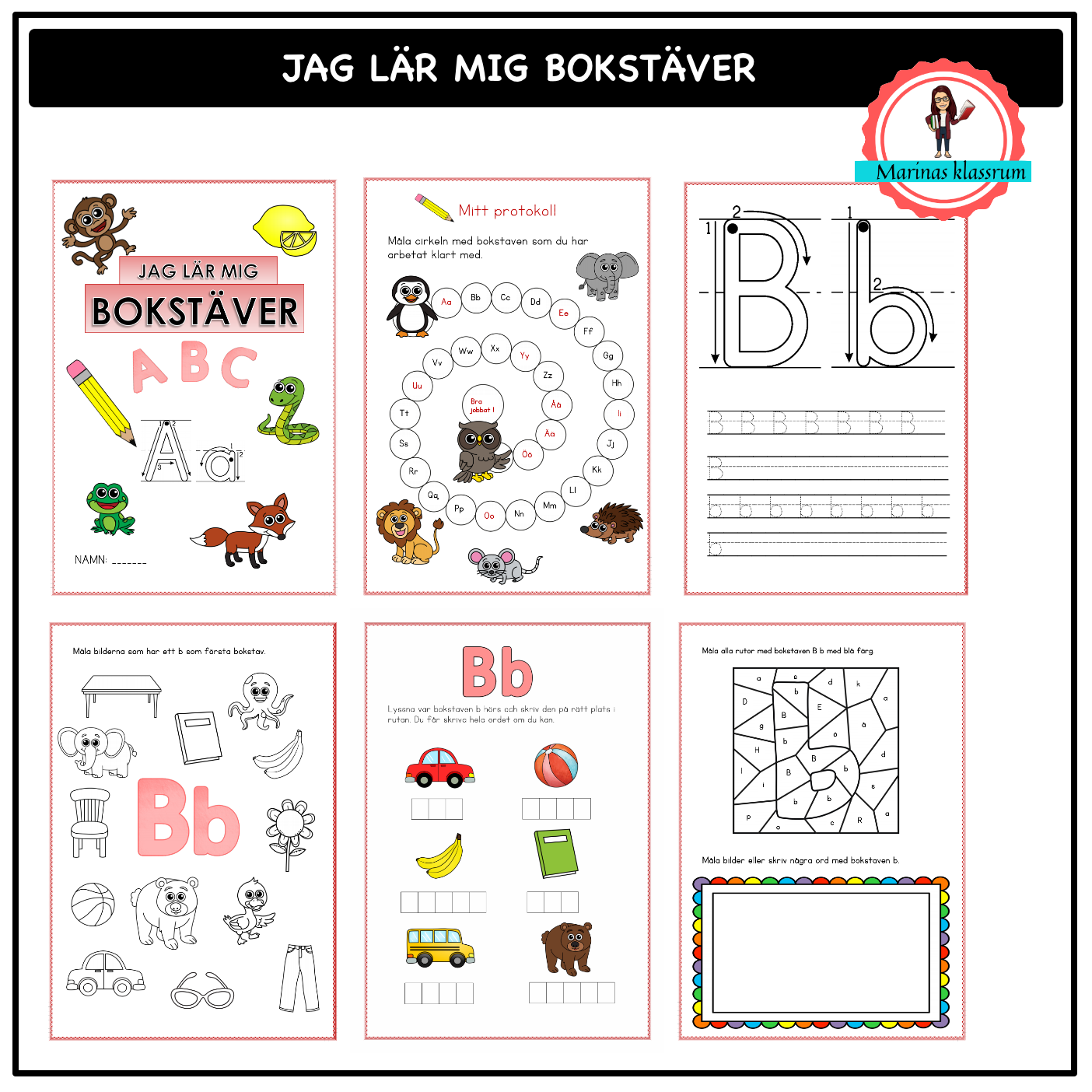 Ett arbetshäfte med bokstäverna på totalt 114 sidor. Materialet bygger på samma bilder som mitt väggalfabet med olika djur som tema. Det finns även ett material som tränar läsning och läsförståelse i två olika nivåer som hör ihop med bokstavsdjuren.