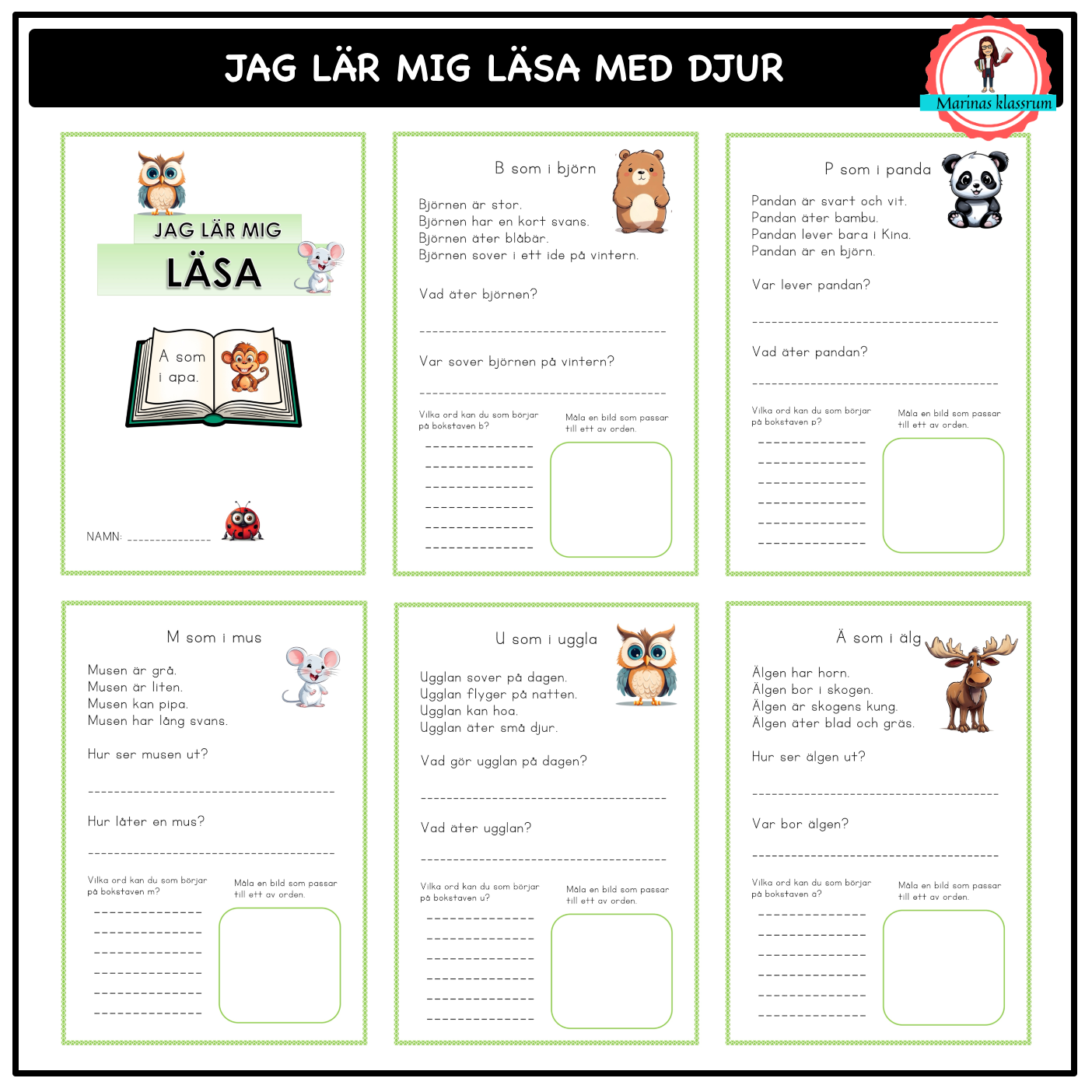 Ett arbetshäfte som tränar läsning. Eleverna läser fyra meningar om varje djur i hela alfabetet och svarar sedan på två frågor. Därefter får de komma på egna ord på den aktuella bokstaven och måla en passande bild till. Samma djur som representerar alfabetet finns även som vimplar till klassrummet.